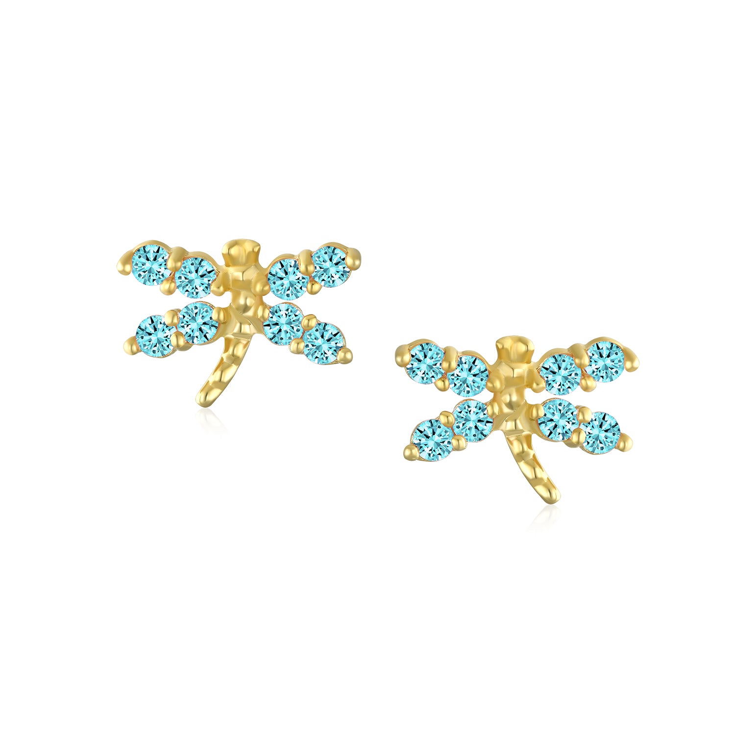 - Enhance your jewelry collection with whimsical 14K gold dragonfly stud earrings. Featuring vibrant CZ stones, they add sparkle and color. Perfect for the young at heart, these playful earrings are finely crafted. The safety screwback ensures secure wear, making them an ideal gift. Add fun and shimmer to your everyday look.