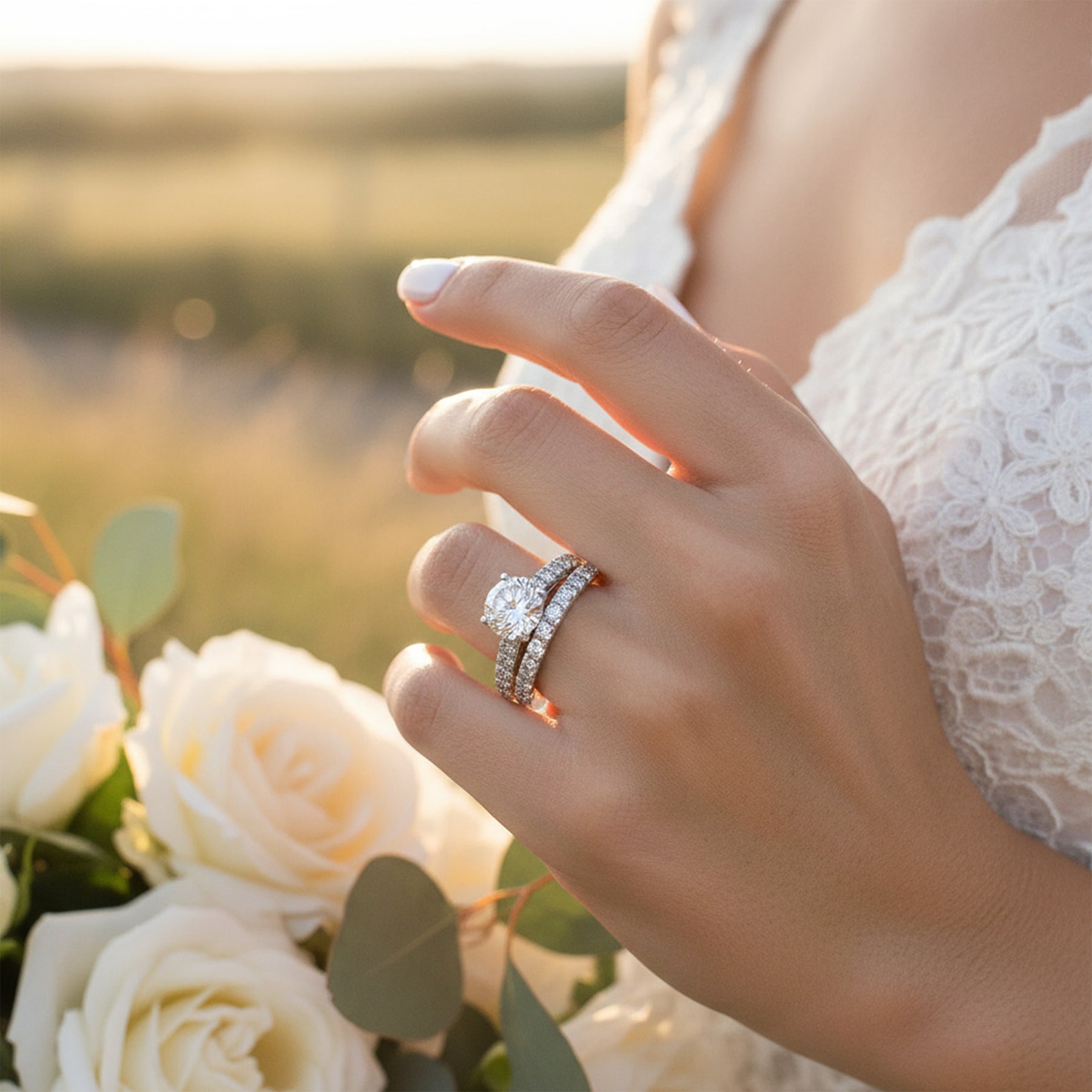 - This stunning 925 sterling silver engagement and wedding solitaire cocktail statement ring set features a 1 carat center stone with rhodium overlays. The bridal set includes a pave cubic zirconia band, bedazzled halfway around. The wedding band showcases pave CZ stones all around. Rhodium plating ensures a super shiny look for this must-have solitaire engagement ring set.