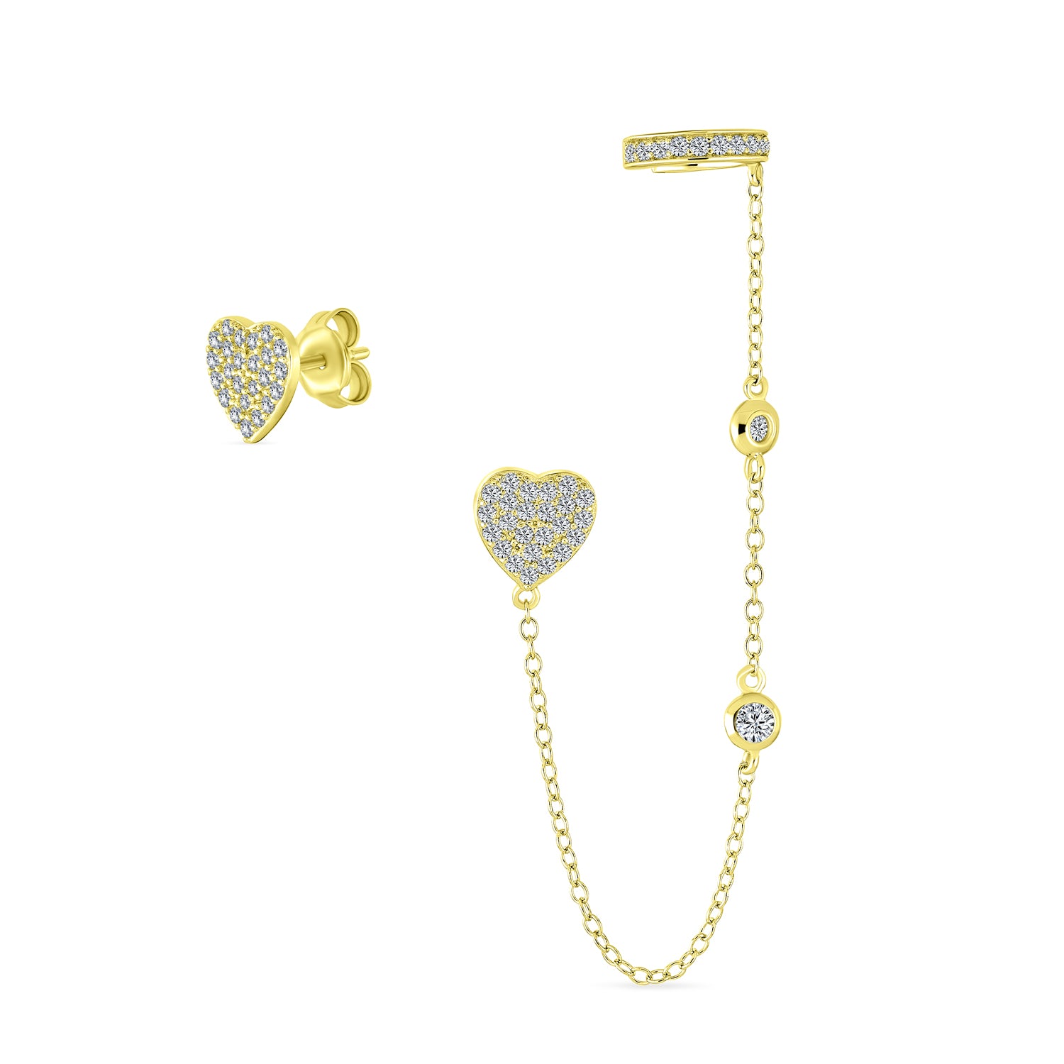 - For a trendy, fashionable twist on a feminine look, choose this sumptuously chic, gold plated sterling silver and cz earrings set. Featuring a stud earring, and a separate chain linked cuff earring with stud for the other ear, with cz heart design.
