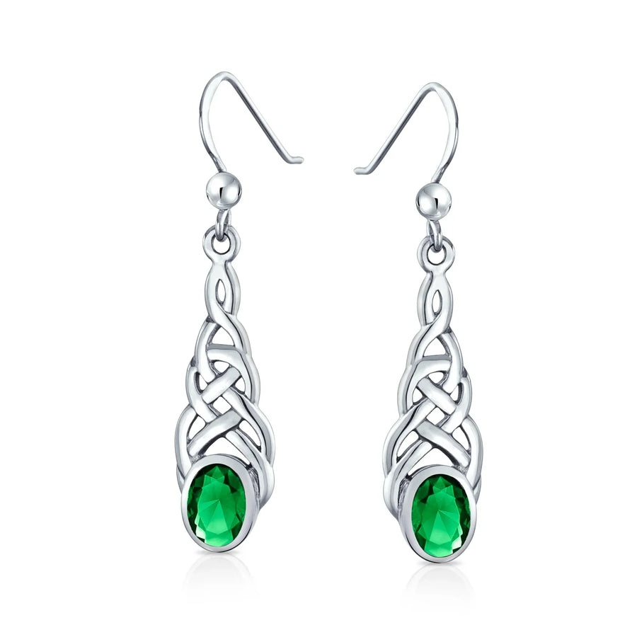 • Embrace timeless elegance with our .925 sterling silver green Simulated Emerald Cubic Zirconia Celtic knot dangle earrings. Inspired by Norse and Chinese designs, these Claddagh earrings captivate with their intricate details. Lightweight and comfortable, they are perfect for daily wear. Ideal as a gift for May birthdays or to showcase your romantic side. Order your pair today and elevate your style.