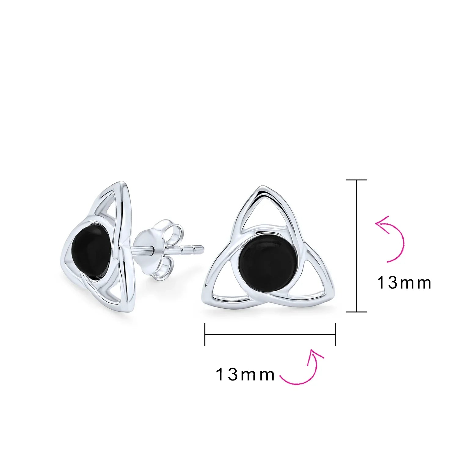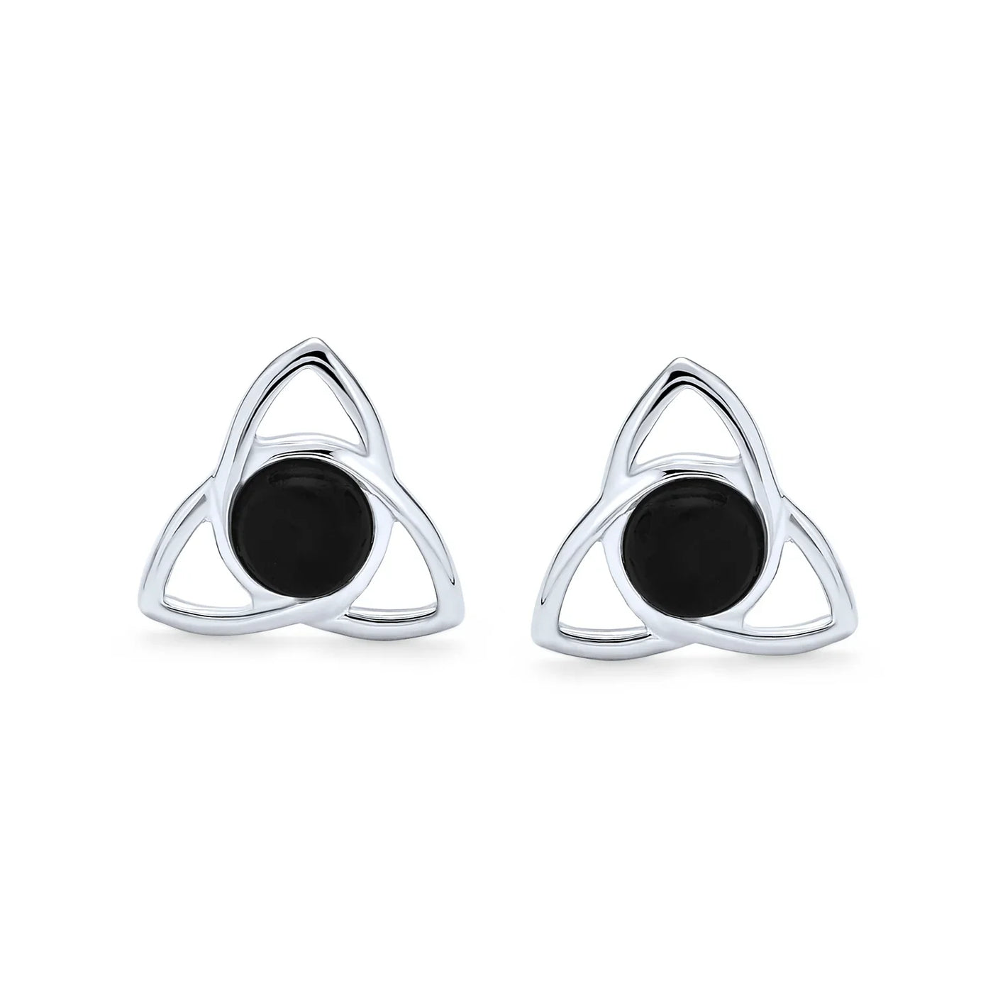 - Experience the timeless beauty of Irish Knotwork with our triquetra Celtic stud earrings. These earrings feature a continuous loop design symbolizing eternity, with a stunning 5mm round black Onyx gemstone at the center. Perfect for pierced ears, these cut-out style earrings are a must-have addition to your jewelry collection.