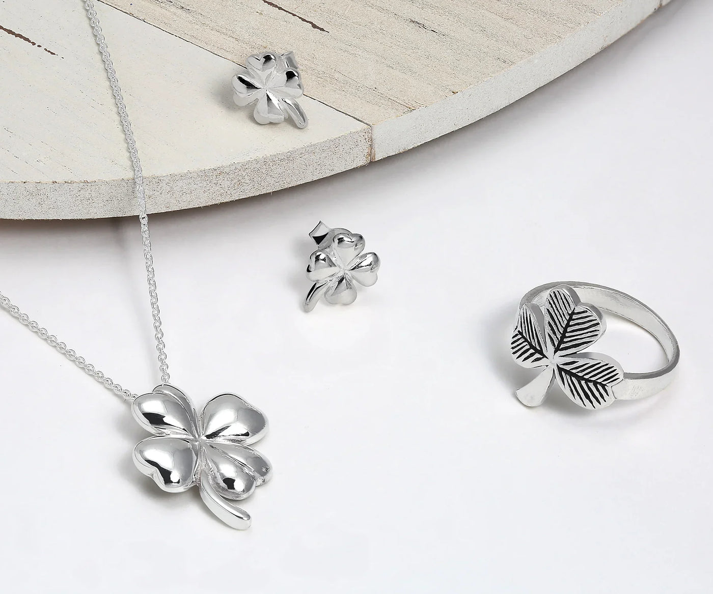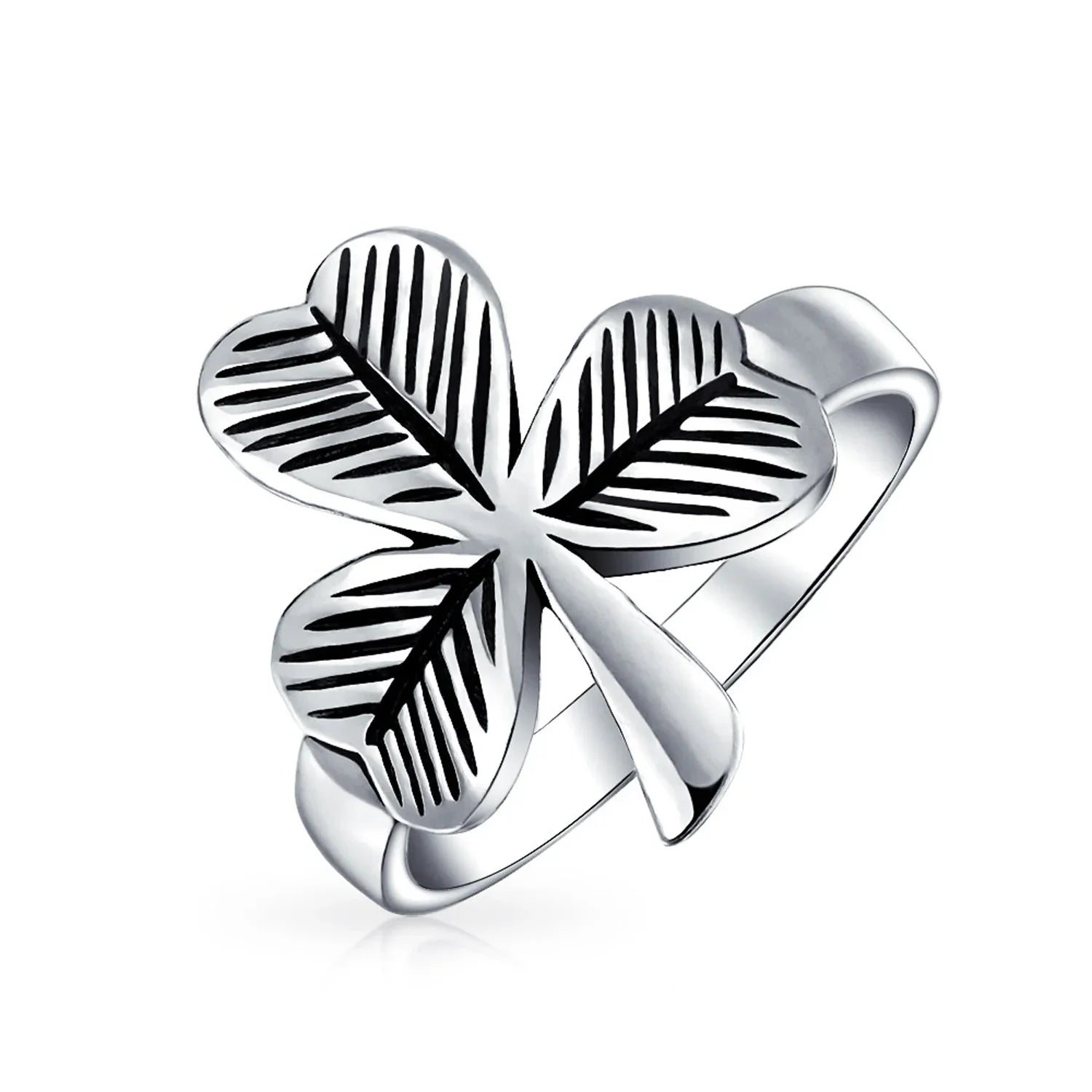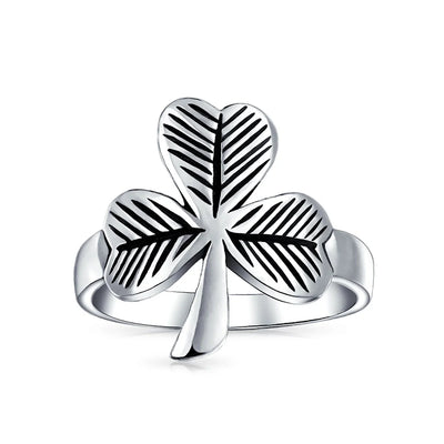 - Our sterling silver 3 leaf clover flower ring is made in an antiqued style with heart shaped petals for some extra love. Flaunt a new sterling silver clover ring when you are feeling lucky and add a perfect finishing touch to any ensemble. Let the luck of the Irish be at your fingertips with some new sterling silver St. Patrick's Day jewelry. Material: .925 Sterling Silver, Measure: 3mm Band Width, Weight: 3.60 grams