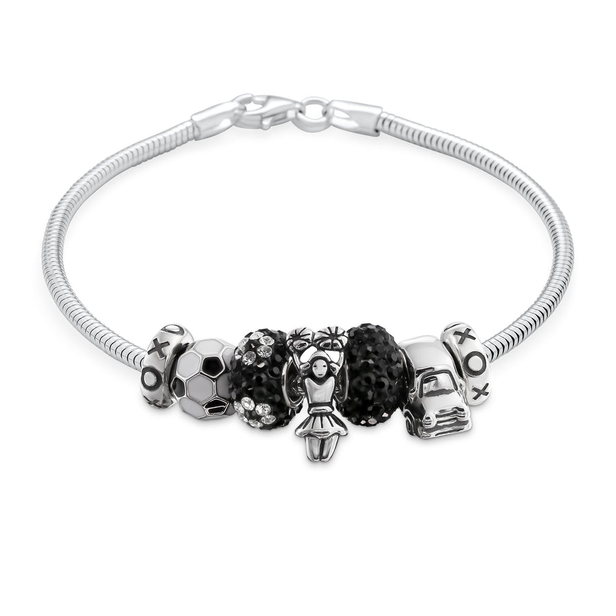 • This beautifully designed .925 silver charm bracelet is the ultimate soccer mom accessory, combining sporty flair with a touch of fun. It features a lively assortment of bead charms, including a soccer ball, Jeep SUV, and a cheerleader charm at the center, creating a playful and spirited look.