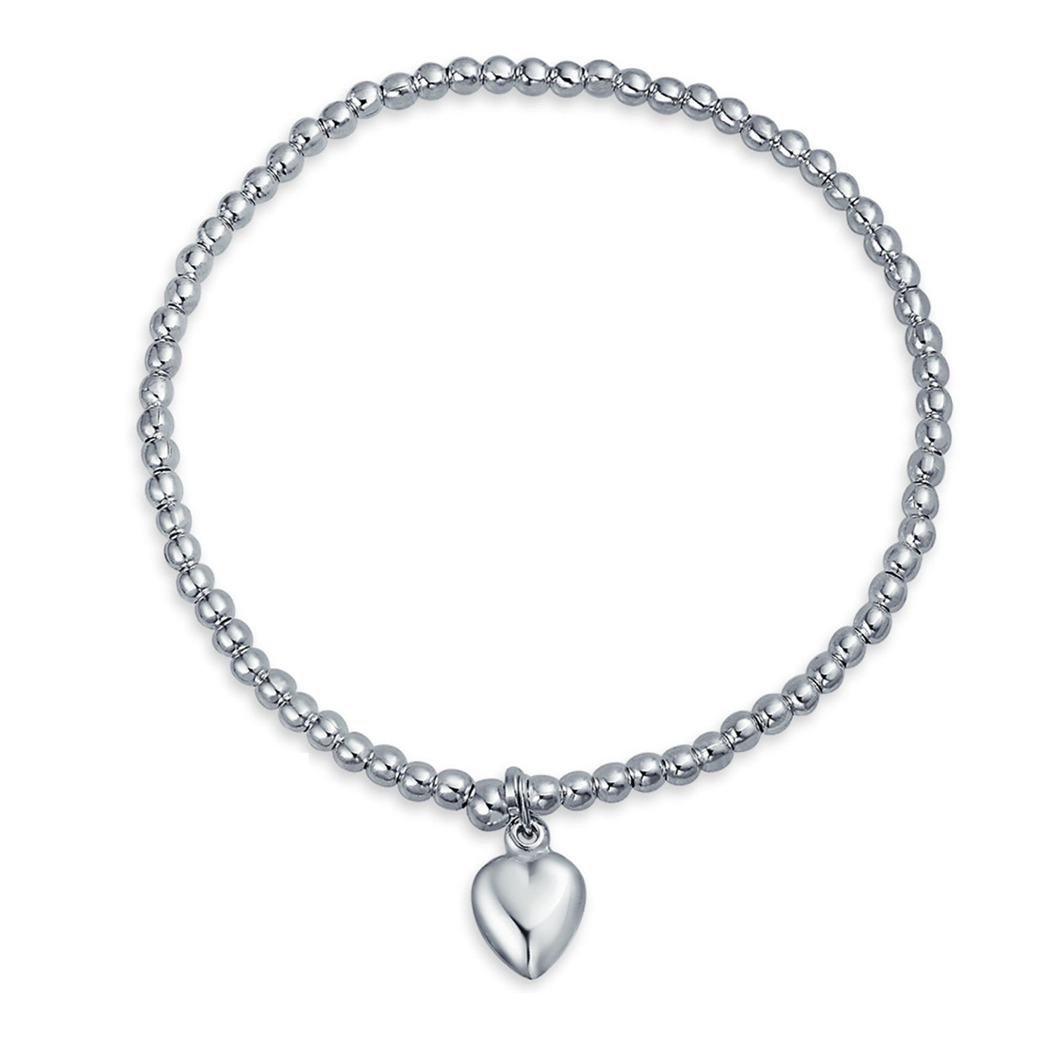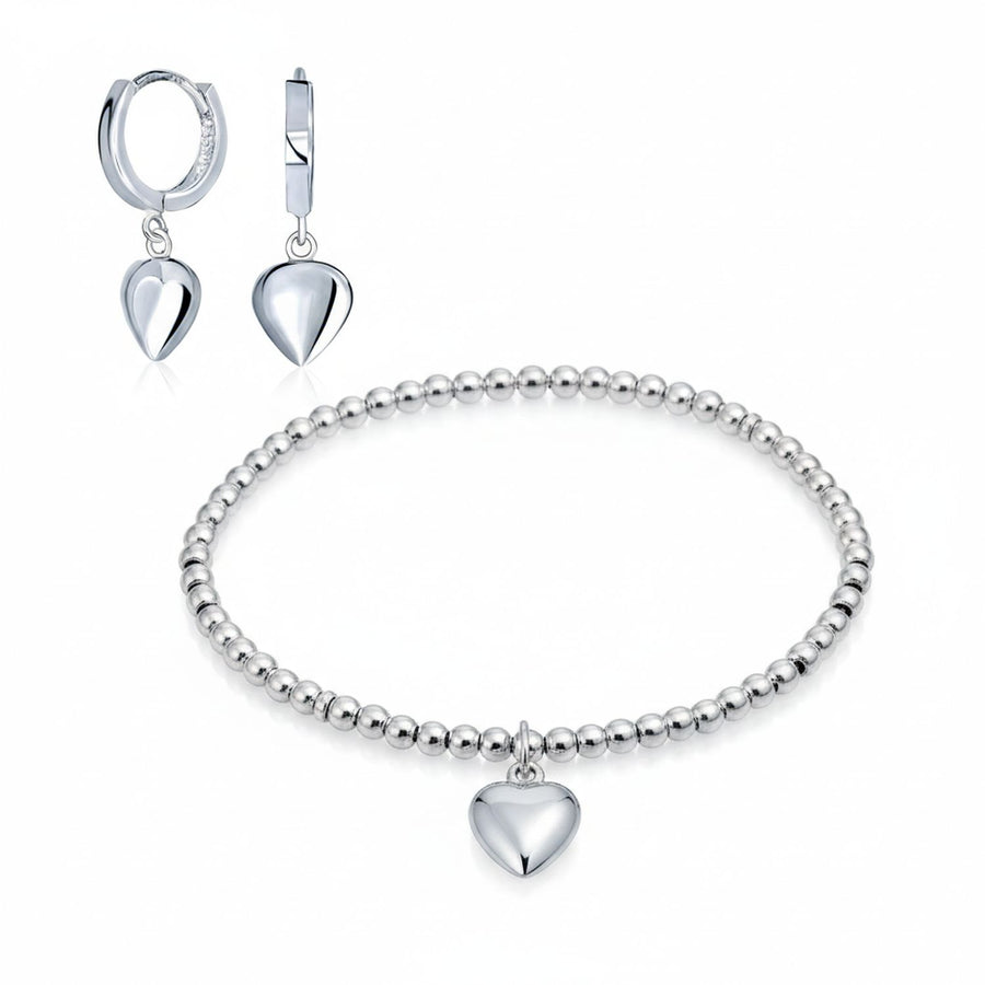 - Celebrate love and elegance with this charming sterling silver jewelry set, featuring a dainty 3mm beaded stretch bracelet with a petite heart tag charm and a matching pair of puff heart dangle huggie hoop earrings. Crafted from genuine .925 sterling silver, each piece radiates a timeless shine and romantic allure. The bracelet’s stretch design ensures a comfortable fit up to a 7.75-inch wrist, while the earrings offer a secure and lightweight feel for everyday wear. Together, they create a heartfelt expression of affection — perfect for gifting on Valentine’s Day, anniversaries, or simply as a symbol of self-love and style.