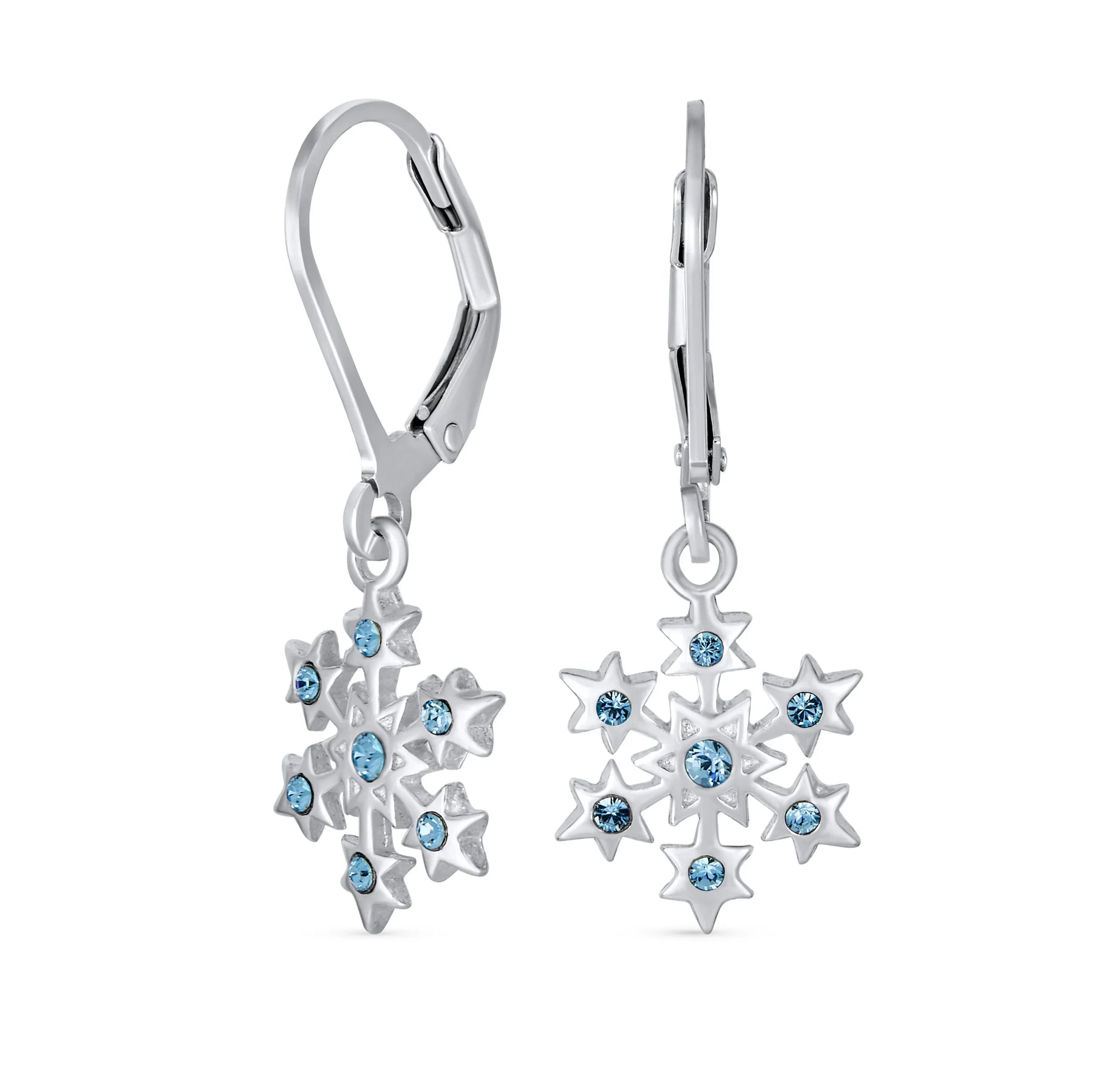 - Embrace winter fashion with radiant 925 sterling silver lever back drop earrings . Featuring sparkling snowflake star motifs, they dazzle. Shimmering simulated blue topaz CZs add a luscious icy blue pop. Perfect for holiday gifts, these earrings ensure you shimmer in style.
