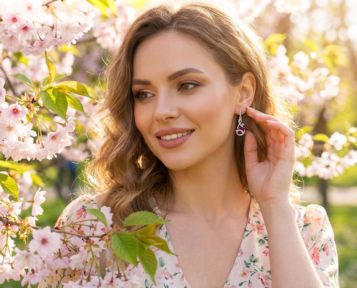 - Elegant yet feminine, any lady will glow with joy with these heart infinity earrings in .925 sterling silver. Red heart shaped CZ is wrap with swirling pave CZs forming a elegant infinity shape earring. Place it upon her ears and tell that your love is forever . A delicately, sparkling faceted red heart dangles from a shimmering cz accented bar. Stunning option for July birthday fine jewelry.