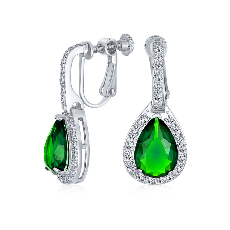 - Elevate your formal look with our stunning Formal Art Deco Estate Style Teardrop CZ dangling clip-on earrings. Perfect for prom, evening wear, cocktail parties, holidays, or as a bridal party gift. Available in a variety of simulated CZ birthstone month colors, these earrings are sure to add a touch of elegance to any outfit. The exquisite pendant necklace features a simulated emerald CZ teardrop centerpiece with a CZ halo, making it a gorgeous choice for a May birthday. The adjustable screw clip-on ensures comfort all day or night.