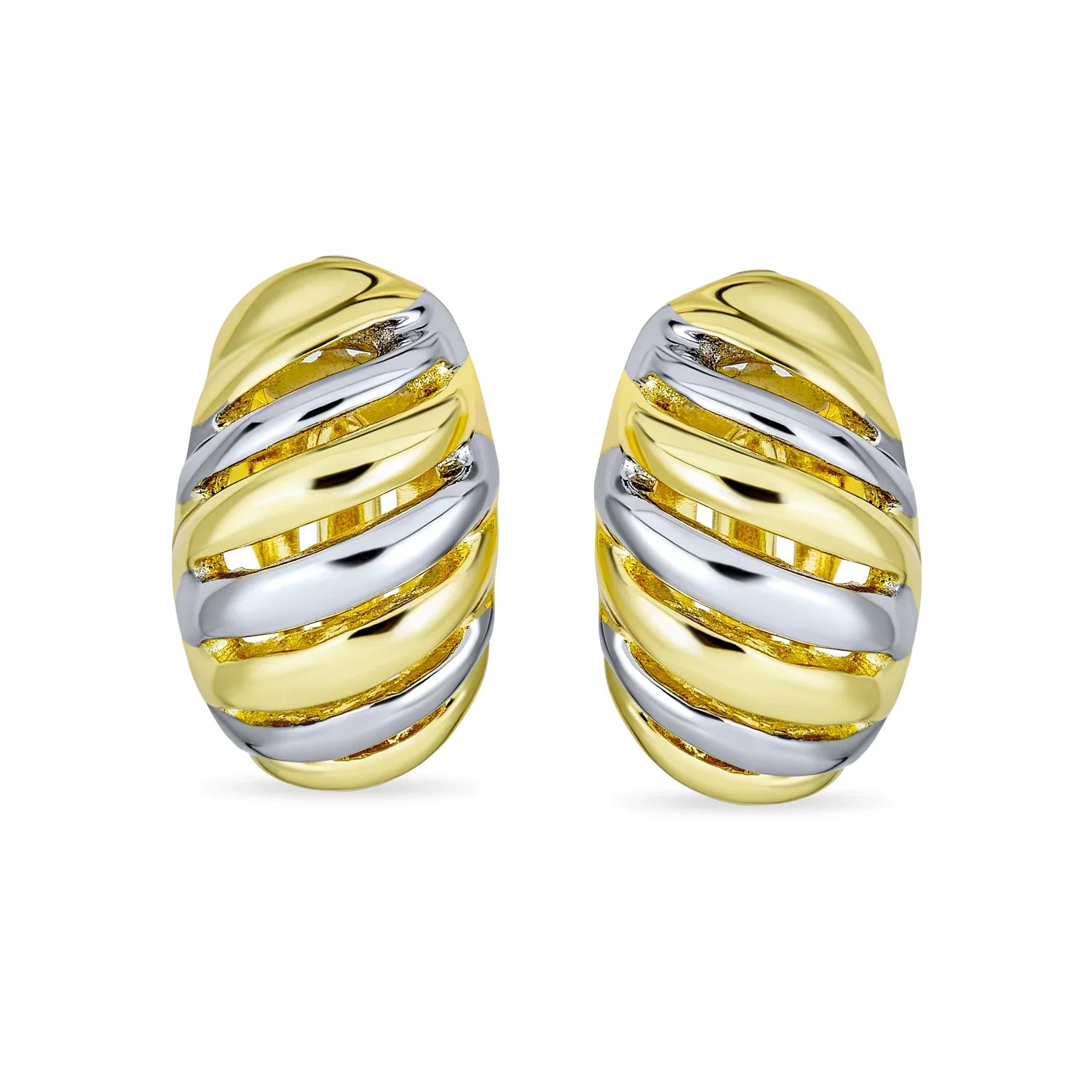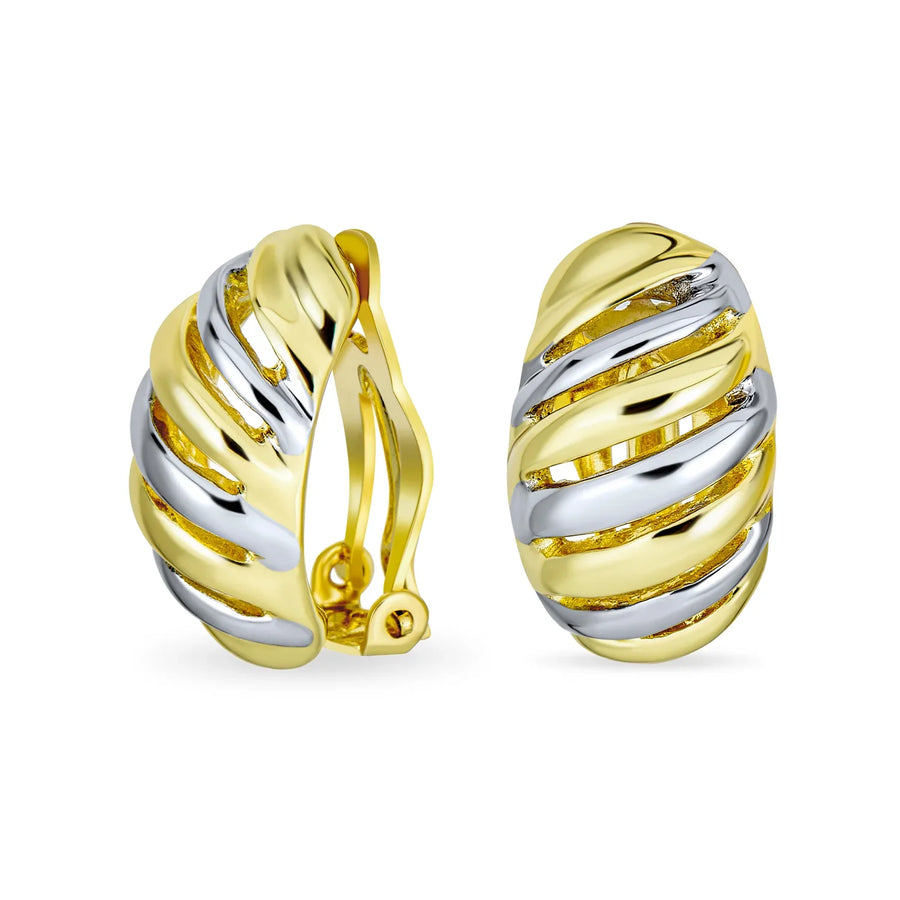 - BEAUTIFUL DESIGN - Elevate your fashion look with these brilliantly striking, two tone clip on earrings for non - pierced ears. Featuring a shrimp style, pattern of gleaming gold plated and rhodium plated brass, and perfect to add everyday zest to your ensemble.