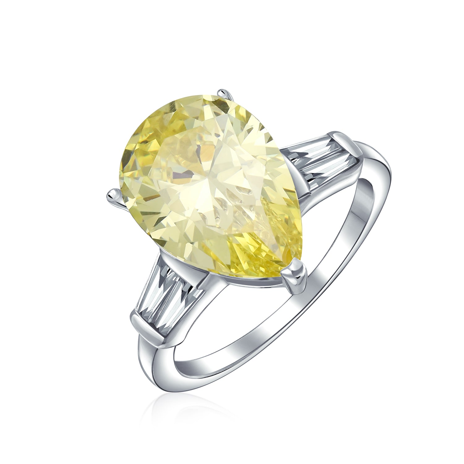 - Add bold sparkle and vibrant color to any jewelry collection with this dazzling 7CT canary yellow pear-shaped CZ statement ring. The alluring teardrop-shaped cubic zirconia center stone is flanked by sparkling baguette-cut CZ side stones, all set on a polished .925 sterling silver band for maximum brilliance. Lightweight yet striking, the thin band ensures comfort while allowing the stunning center stone to shine as the focal point. Perfect for those who love bold, eye-catching rings, this statement piece adds glamour and sophistication to any outfit or occasion.