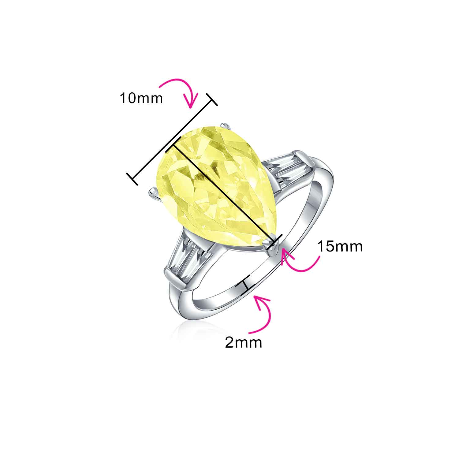 - Featuring a dazzling 7CT canary yellow pear-shaped cubic zirconia, this ring delivers a bold, eye-catching look. Flanked by baguette-cut CZ accents, the teardrop design adds elegance and a touch of classic sophistication.