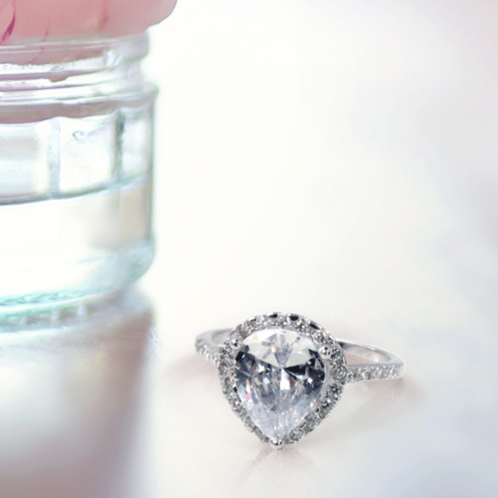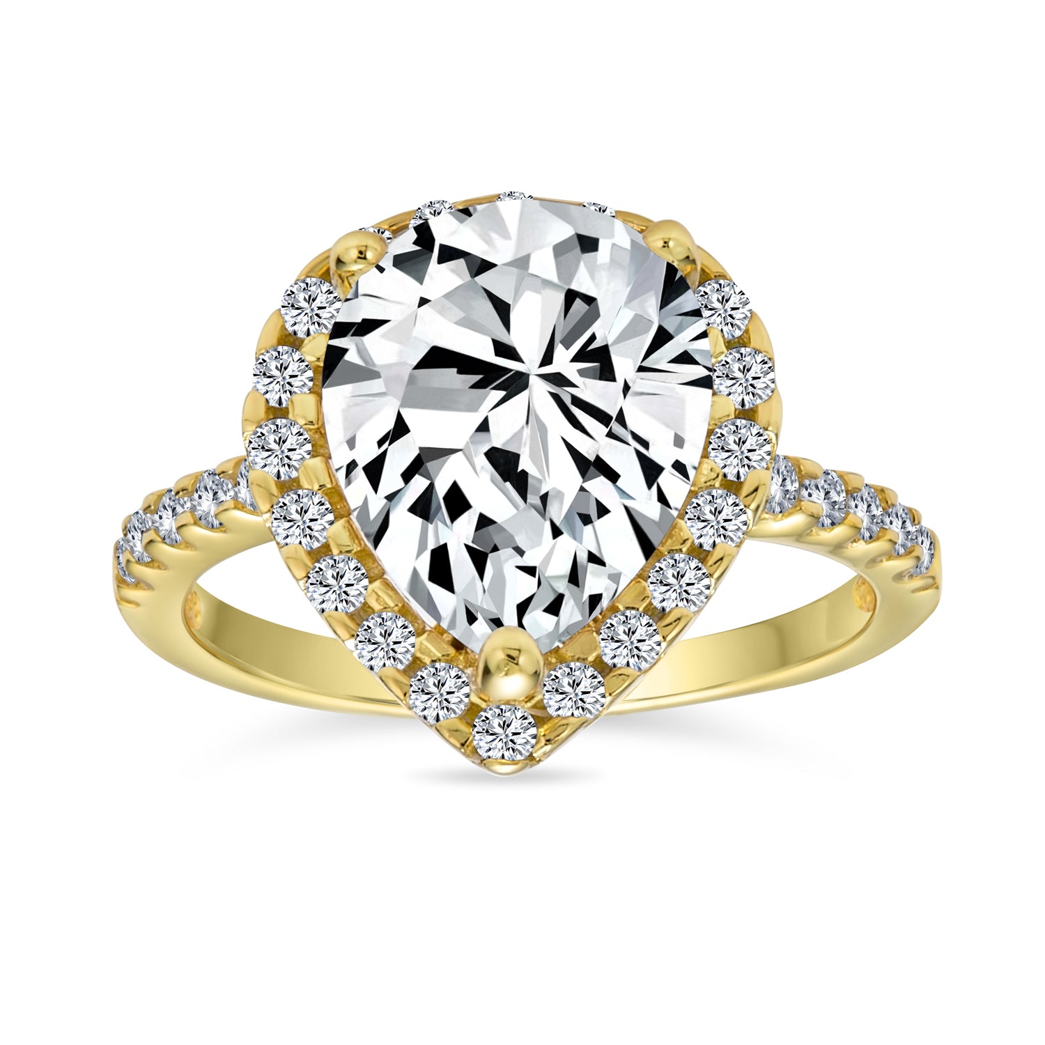 - Enchant your beloved with this bold 7CT pear-shaped CZ solitaire ring. A halo of pave stones adds brilliance to the teardrop design, set in rhodium-plated .925 sterling silver—perfect for promises, anniversaries, or travel-ready elegance.