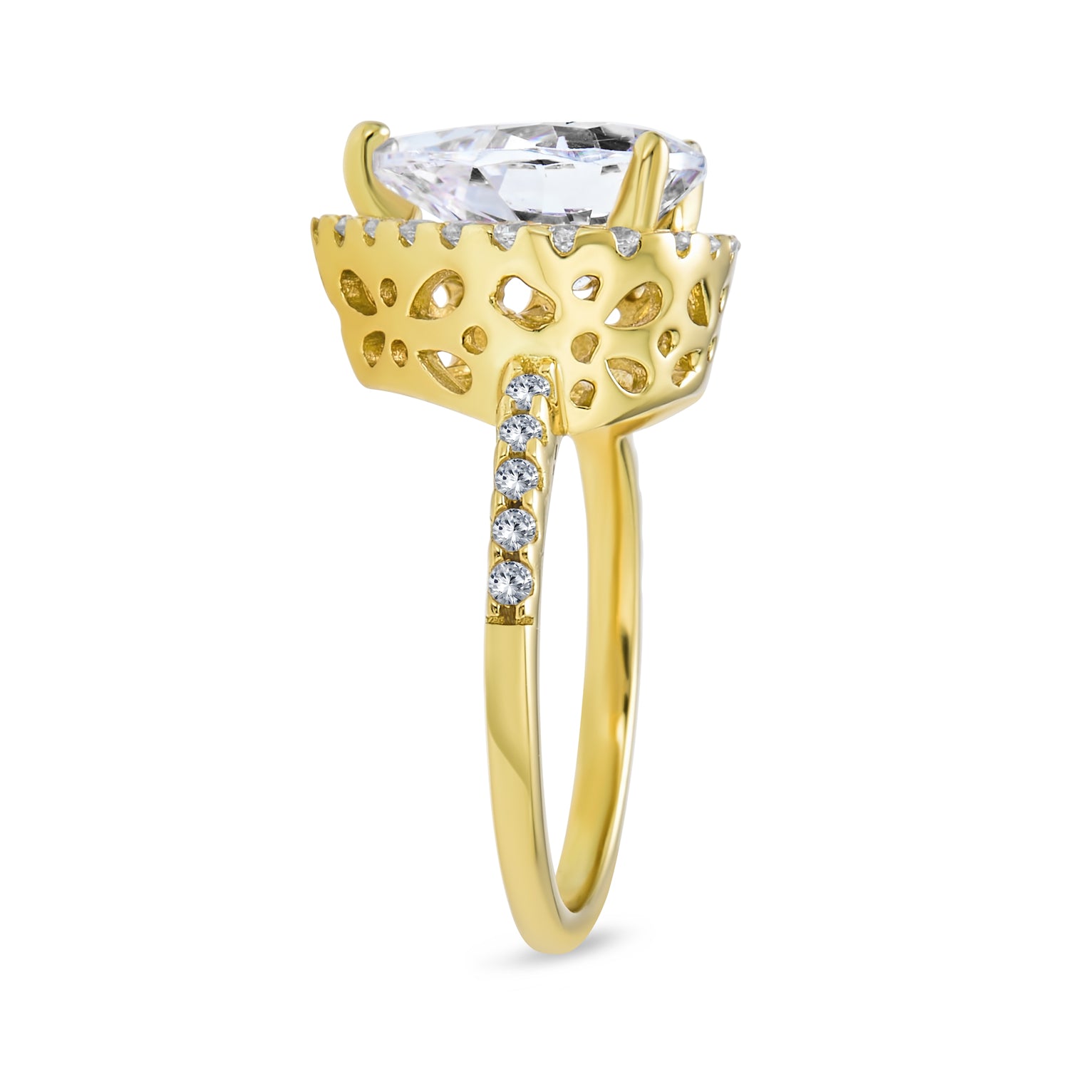 - Enchant your beloved with this exquisitely feminine engagement ring. Featuring a captivating teardrop-shaped CZ stone as the centerpiece, it is beautifully accentuated by delicate butterfly cutouts. The sparkling CZ stones, set in a yellow gold-plated .925 sterling silver band, add a touch of elegance and charm.