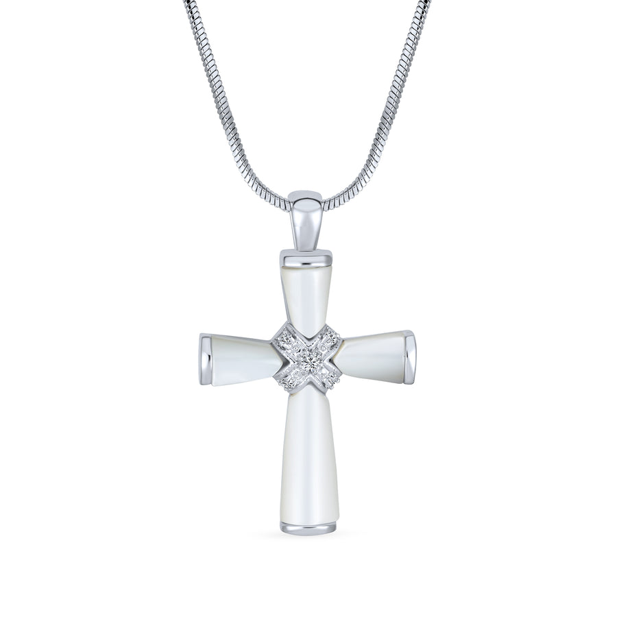 - Our enchanting mother of pearl cross pendant is both fashionable and fresh looking. It is a sophisticated way to display your faith in style. It is suspended from a dainty snake chain that fastens securely with a lobster claw clasp.