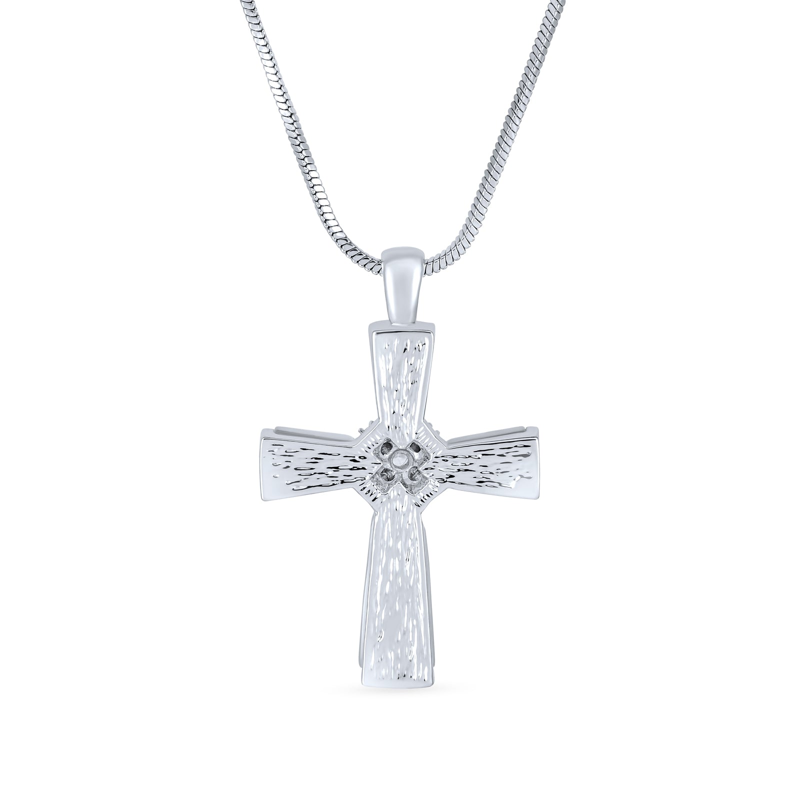 - The CZ cross necklace features a figure-eight pattern with sparkling Cubic Zirconia stones. Ideal gift for religious jewelry lovers. Lightweight and lovely pave cross design. Made of rhodium-plated brass, measures 1.25 inches. Suspended from a dainty snake chain with a secure lobster claw clasp. Includes a 2-inch extender for versatile wear. Perfect with sweaters or warm-weather outfits.
