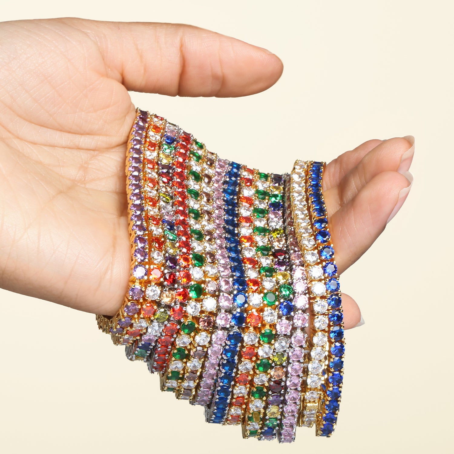 - Add a touch of elegance to any outfit with this stunning tennis bracelet featuring shimmering green hues and simulated Emerald round CZs prong basket set . Perfect for a May birthday or as a thoughtful bridal gift for bridesmaids. The term "tennis bracelet" has a fascinating origin story dating back to a memorable incident at the 1987 U.S. Open.