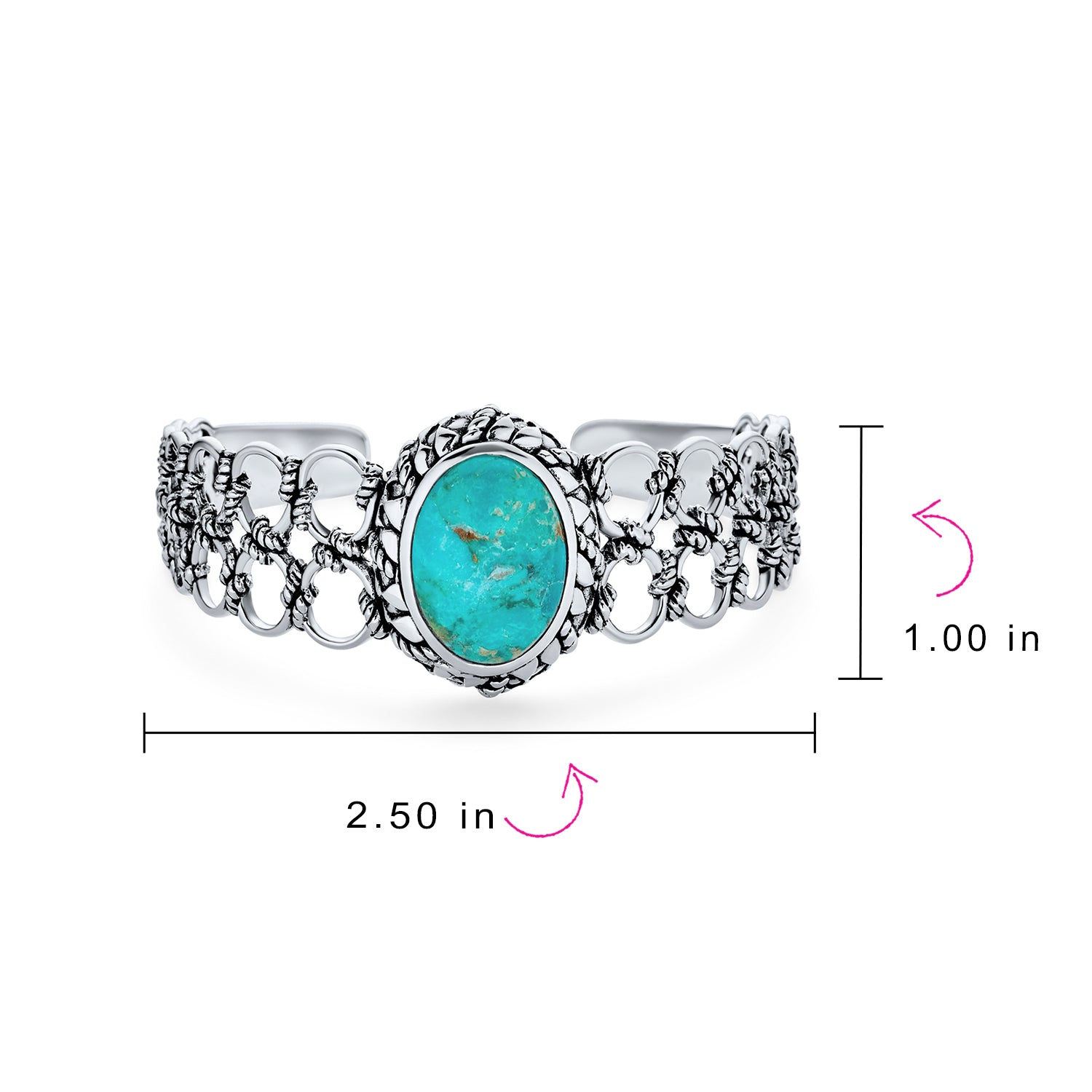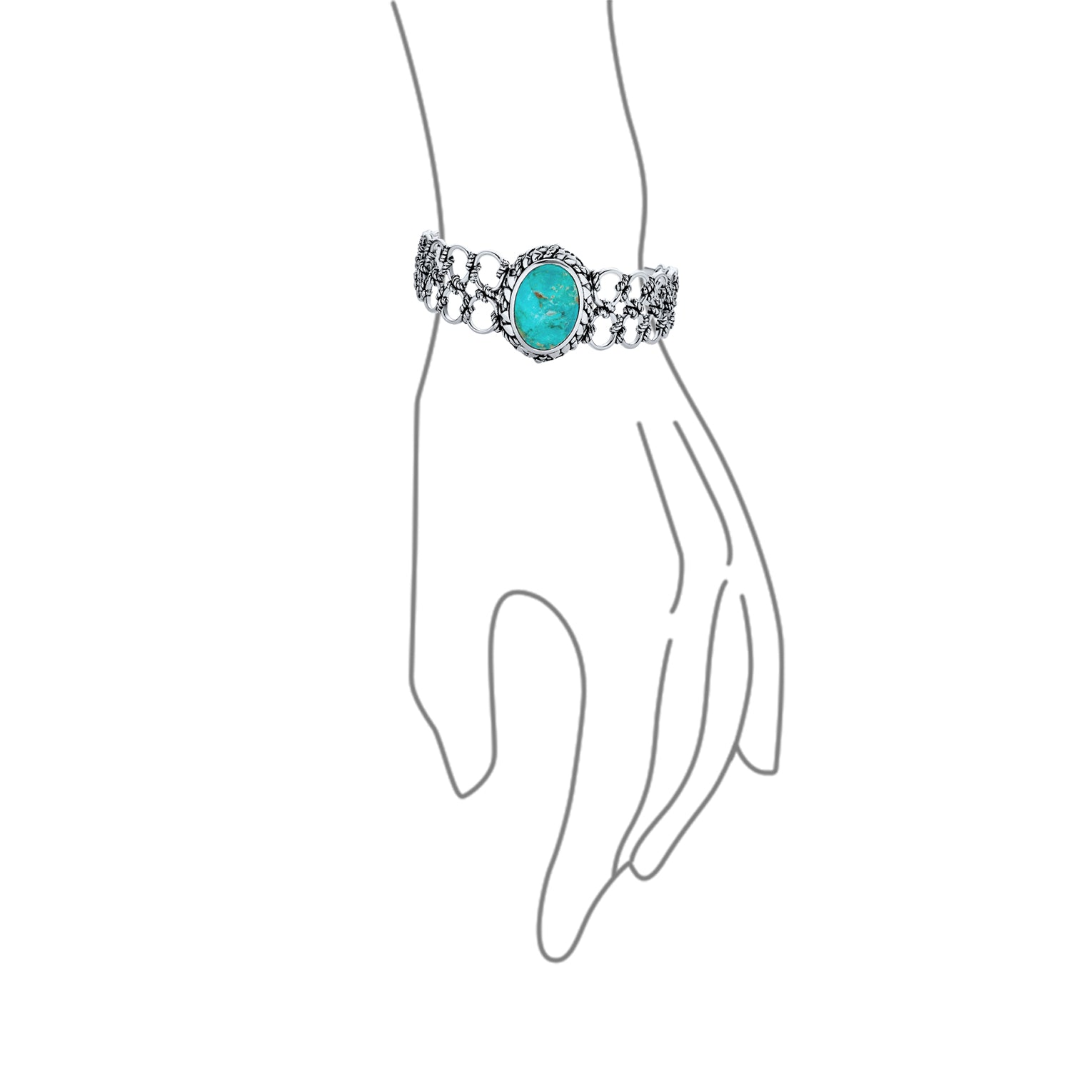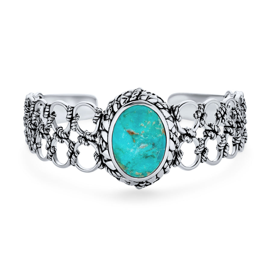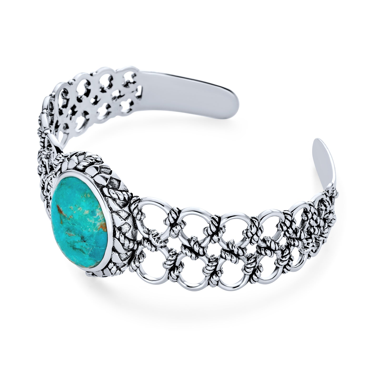 - Captivate in vibrant color with this stunning 925 silver cuff bracelet. Features a vivid oval cabochon Stabilized Turquoise centerpiece. Intriguing nautical rope detailing adds an oceanic twist to southwest style. Enhance any outfit, from blue jeans to night-out dresses.