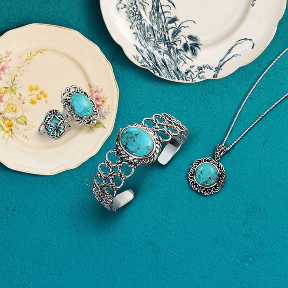 - Featuring a beautifully vivid, oval cabochon, Stabilized Turquoise, bezel -set centerpiece