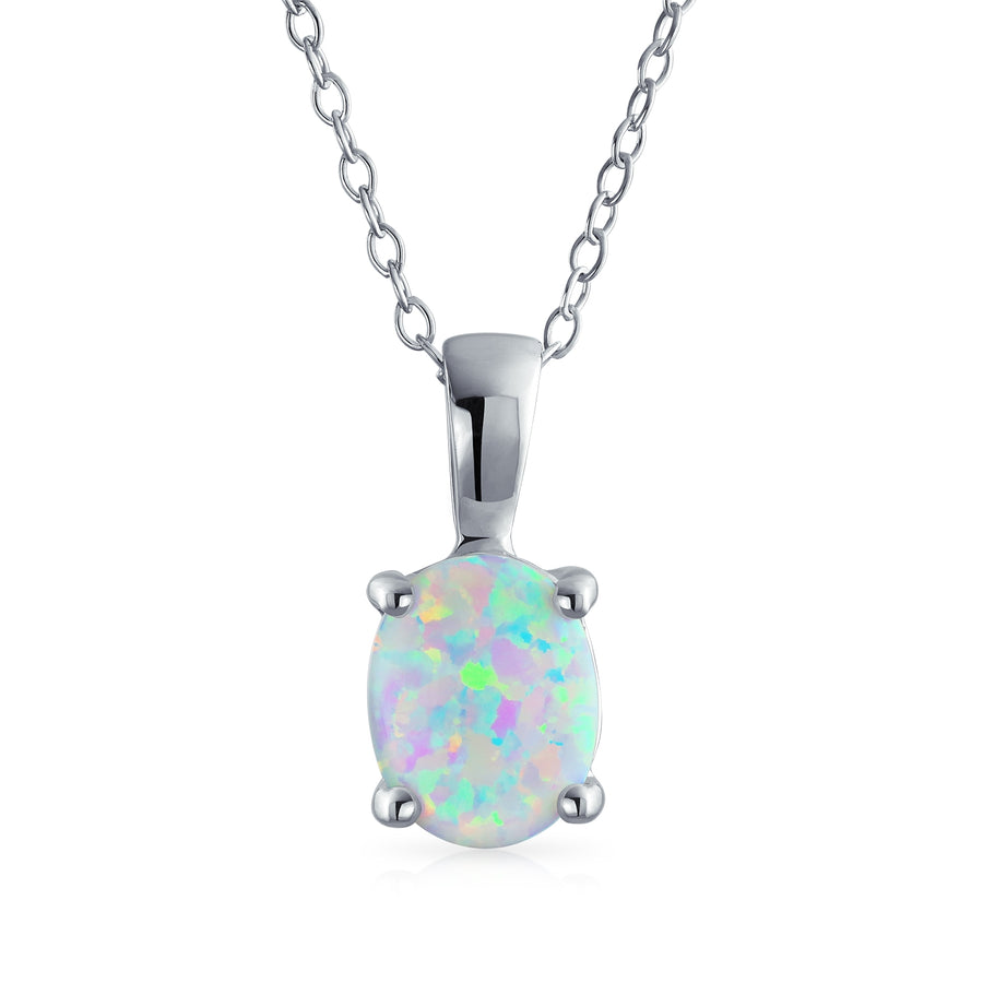 • This delicate petite white created opal pendant is a great gift for layering, dressing up or dressing down. This oval solitaire style, 16 inch necklace has a sparkling finish that draws attention to the four prong set October birthstone.