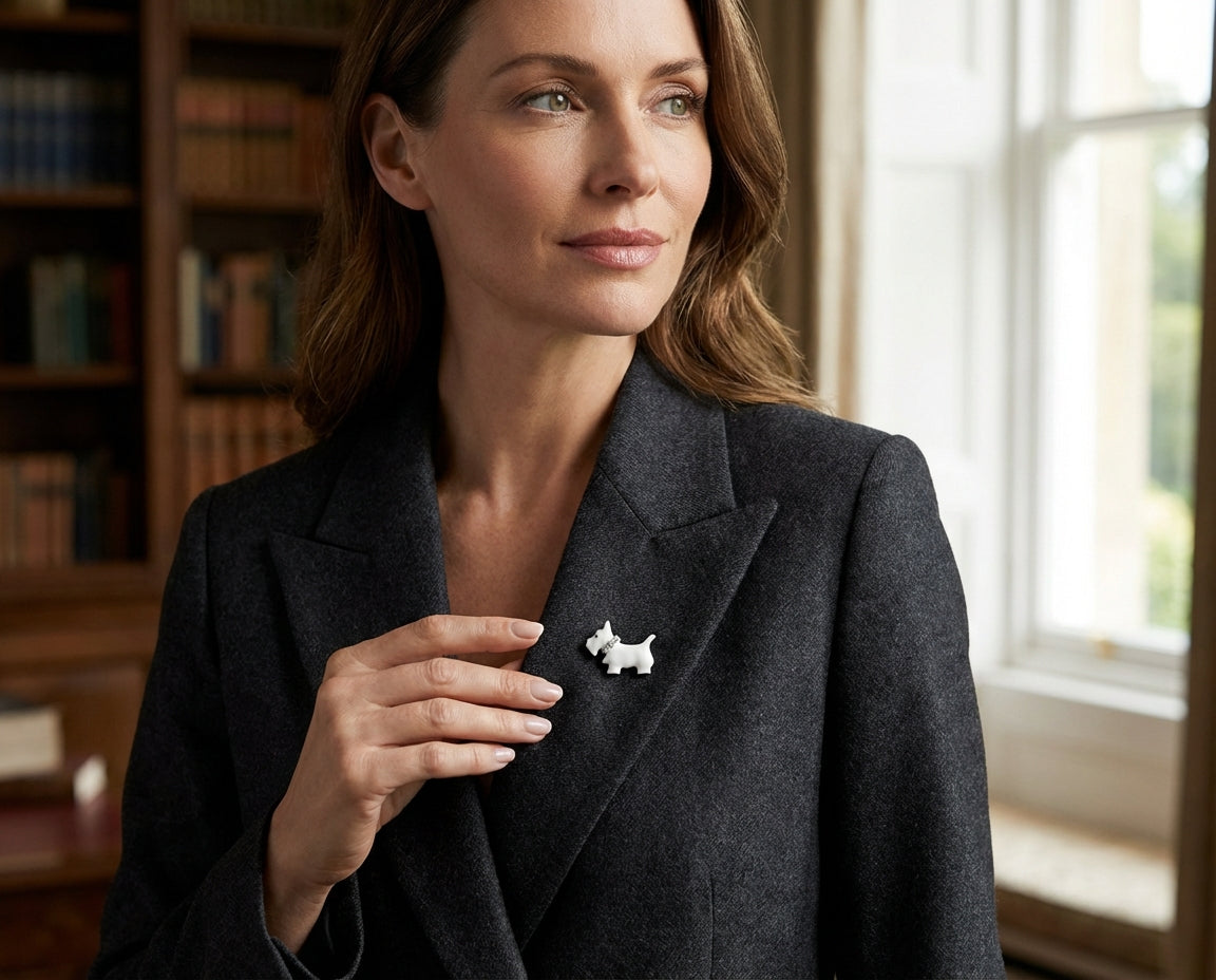 - Charm the Lady Westie lover in your life with this darling, rhodium plated alloy, animal brooch pin. Highlighted by a delightfully sweet, Westie dog terrier motif with sparkling crystal accented collar, this darling puppy pin is sure to melt your heart.