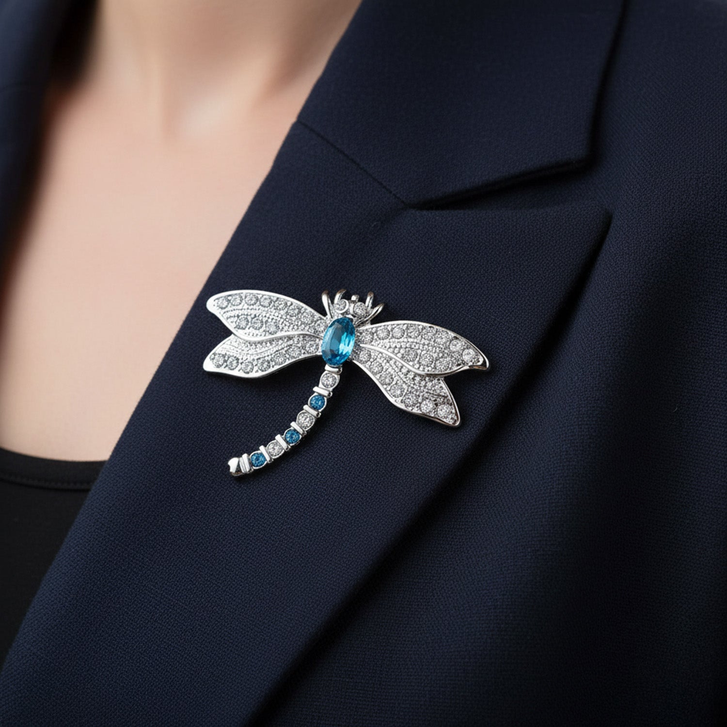 - This exquisite vintage-style Brooch features a chic dragonfly design. Rhodium-plated brass and CZ, intricately detailed with clear CZs on wings. The tail glows with simulated sapphire blue and clear cubic zirconia, ending in a glittering blue oval CZ.