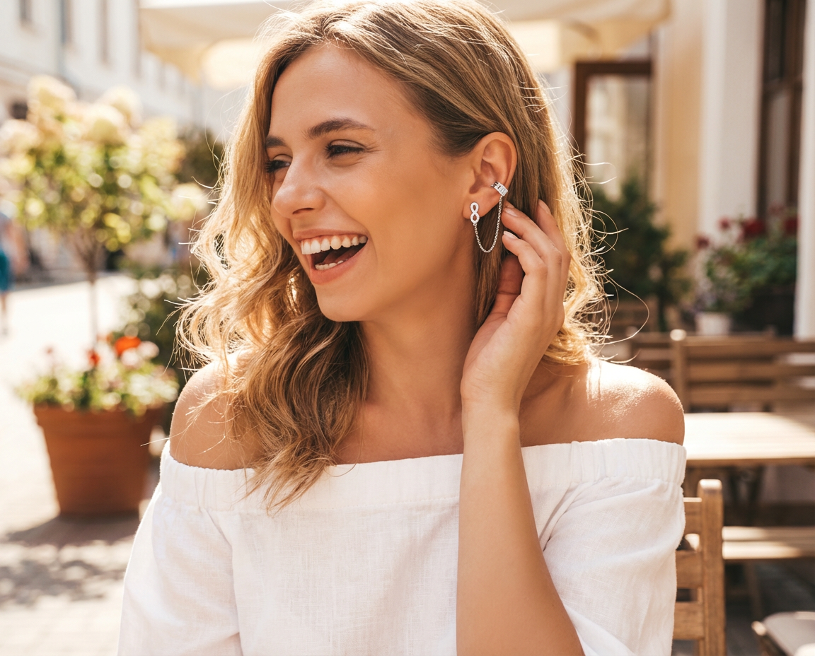 - For a trendy twist on a feminine look, choose these chic infinity sign, rhodium plated and CZ earrings. Featuring a stud earring, and a separate chain linked cuff earring with stud for the other ear.