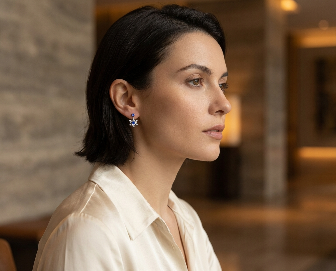 - Elevate your look with these stunning .925 silver earrings, featuring a dazzling simulated sapphire stud and a detachable ear jacket with a delicate snowflake flower design.