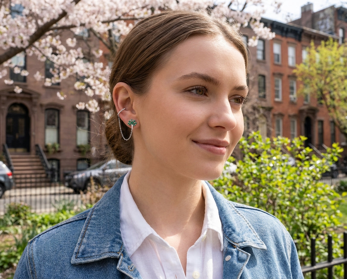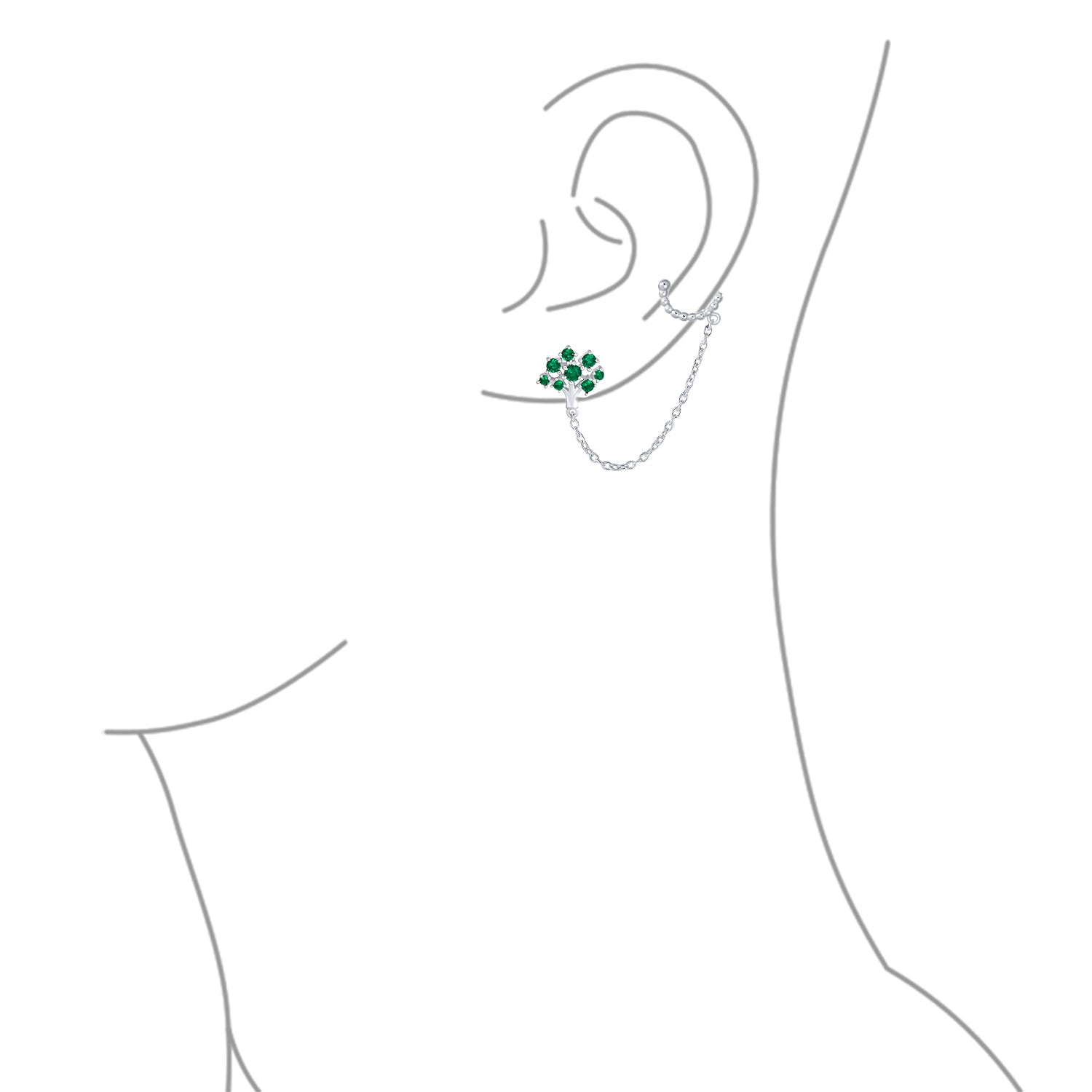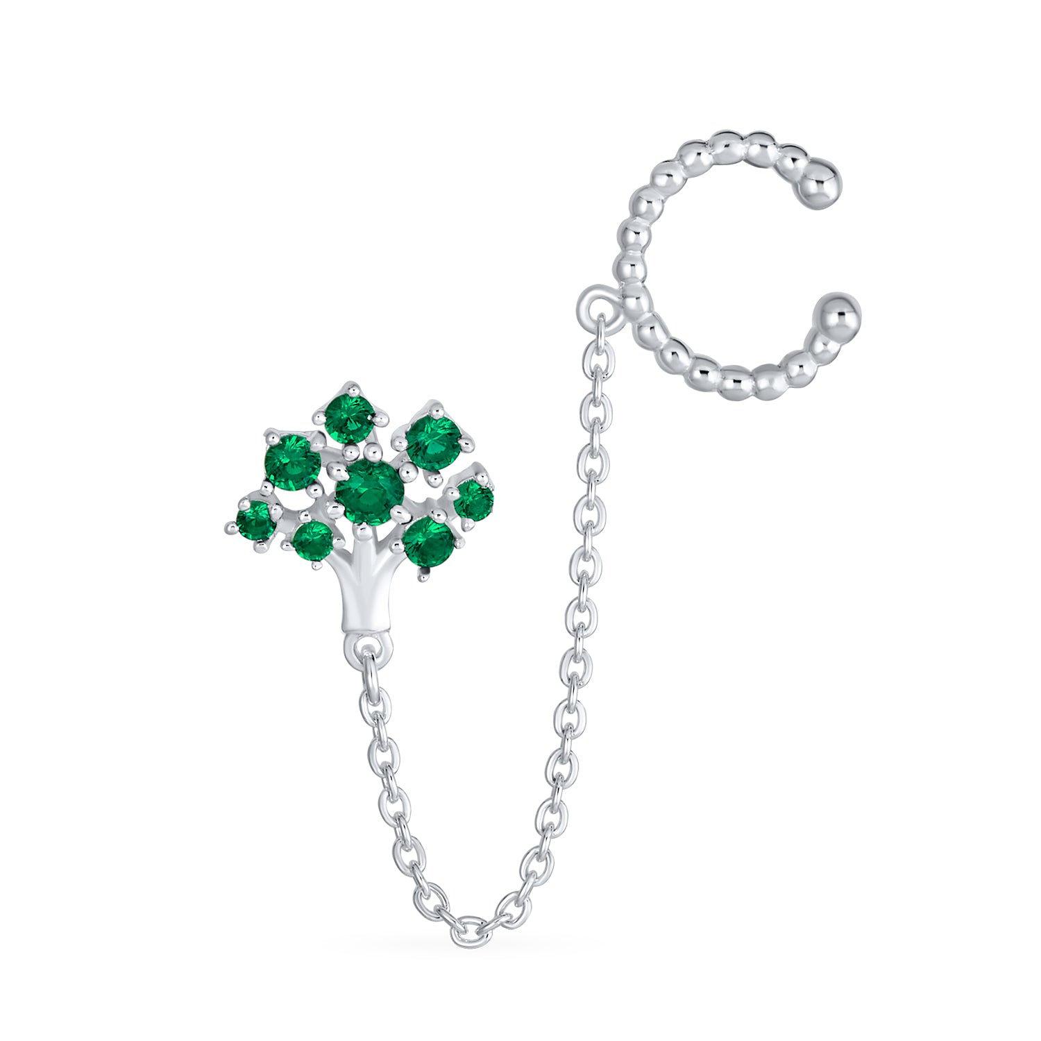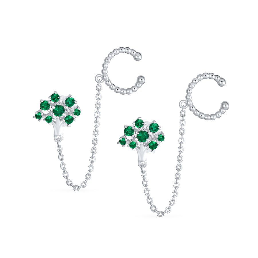 - These radiant and unique drop earrings are crafted from glistening yet affordable .925 sterling silver. Featuring an elegant tree of life design with green CZ stones, they capture attention effortlessly. Be the center of attention and indulge in good fortune with these original earrings. Perfect as a gift for anyone on your list. One cuff connects to a chain, adding a rebellious vibe. Shimmering cubic zirconia stones accent your ear from every angle. Don't miss out on the latest trend in women's earrings.