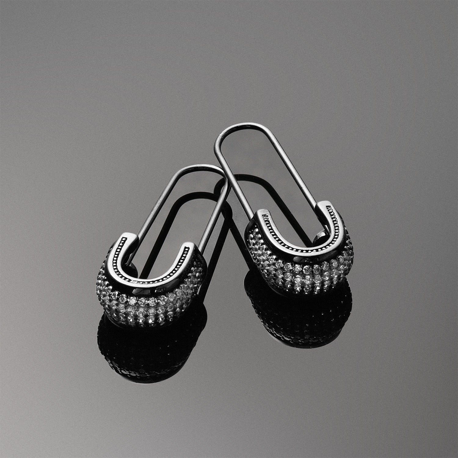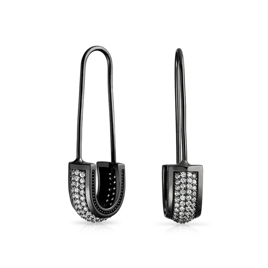 - Safety pin jewelry is back, adding an edgy vibe to your style. Sterling silver earrings with black rhodium plating and CZ accents. Perfect for gothic jewelry fans, these black earrings are a must-have. Make these Threader earrings your go-to silver pair.