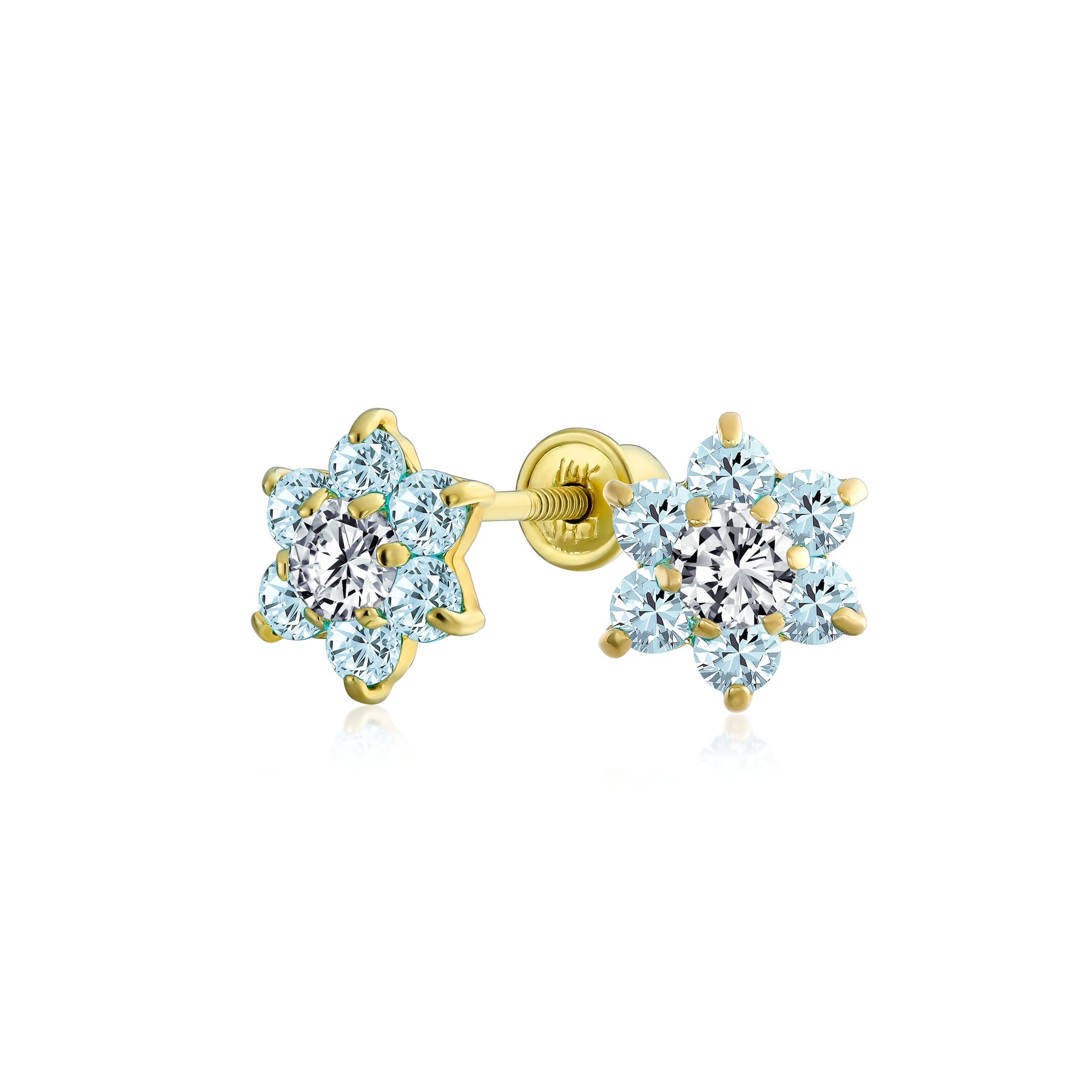 - Adorable flower stud earrings for your super style. Vividly colorful design with clear and Simulated Aquamarine CZs. Gleaming 14k gold. Perfect March birthday gift. Lightweight with screw back post for comfort. Order today!