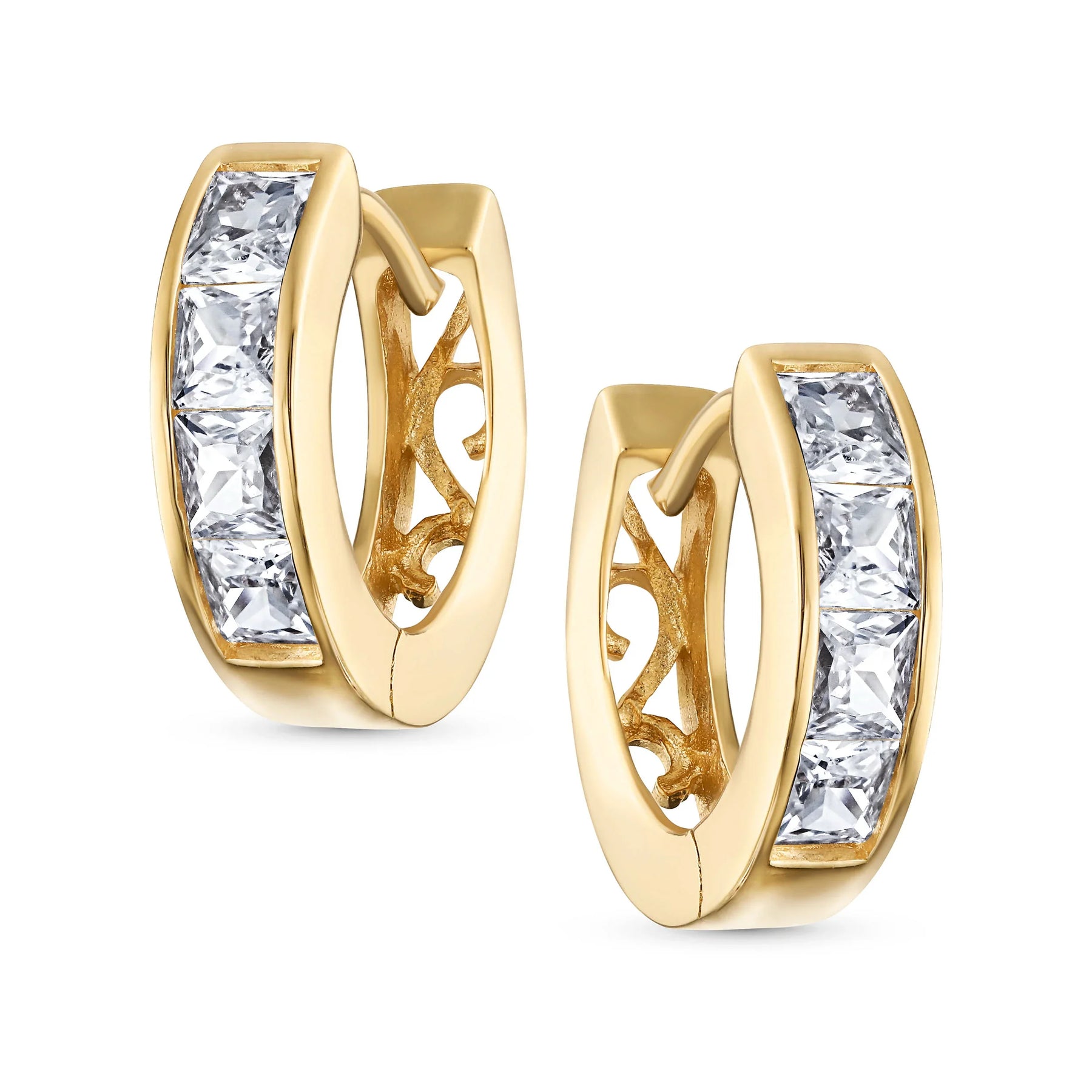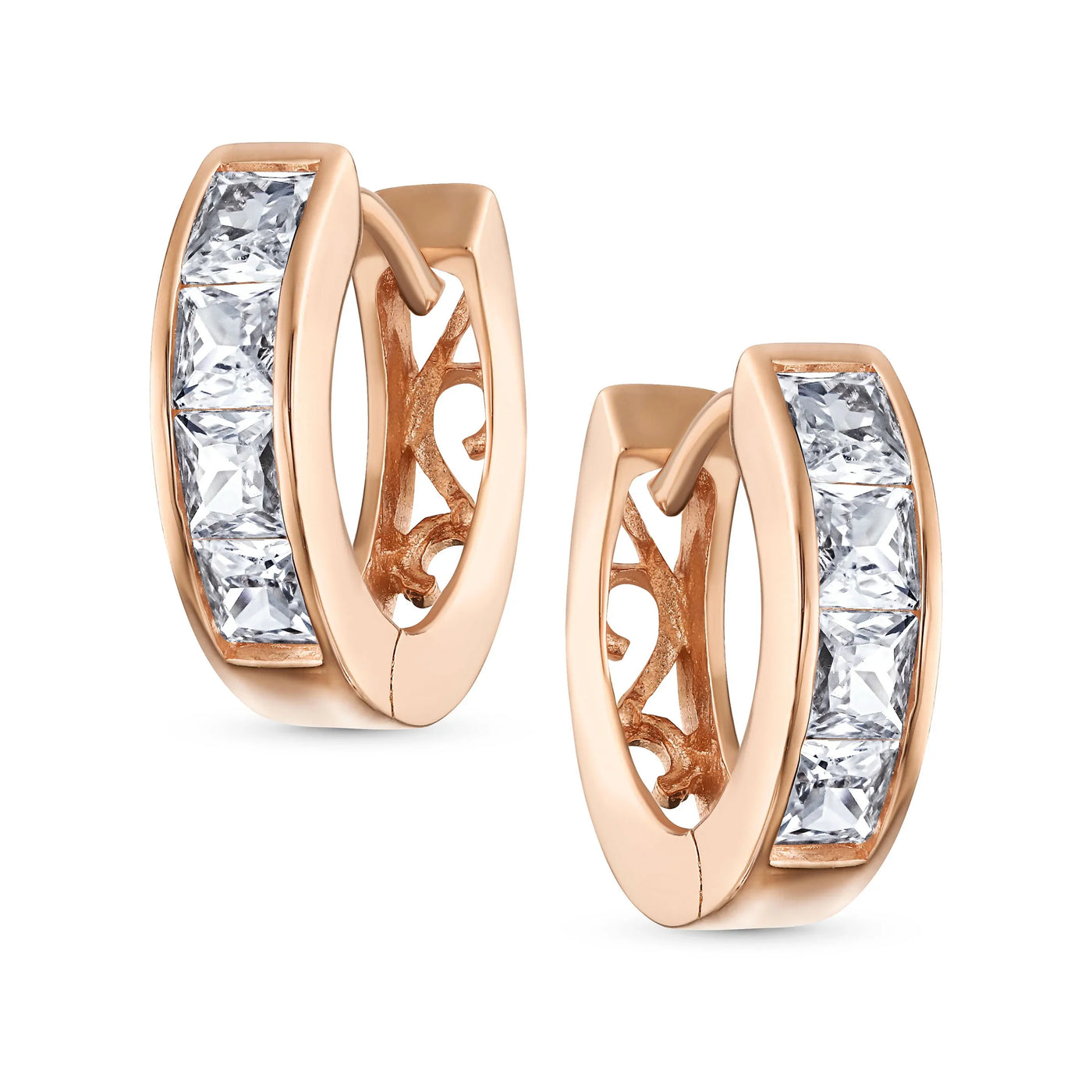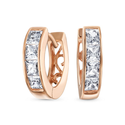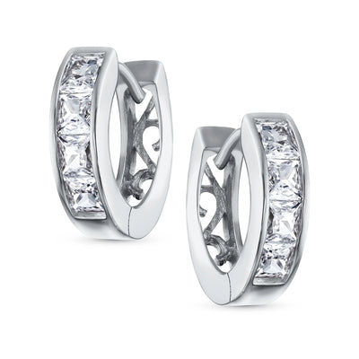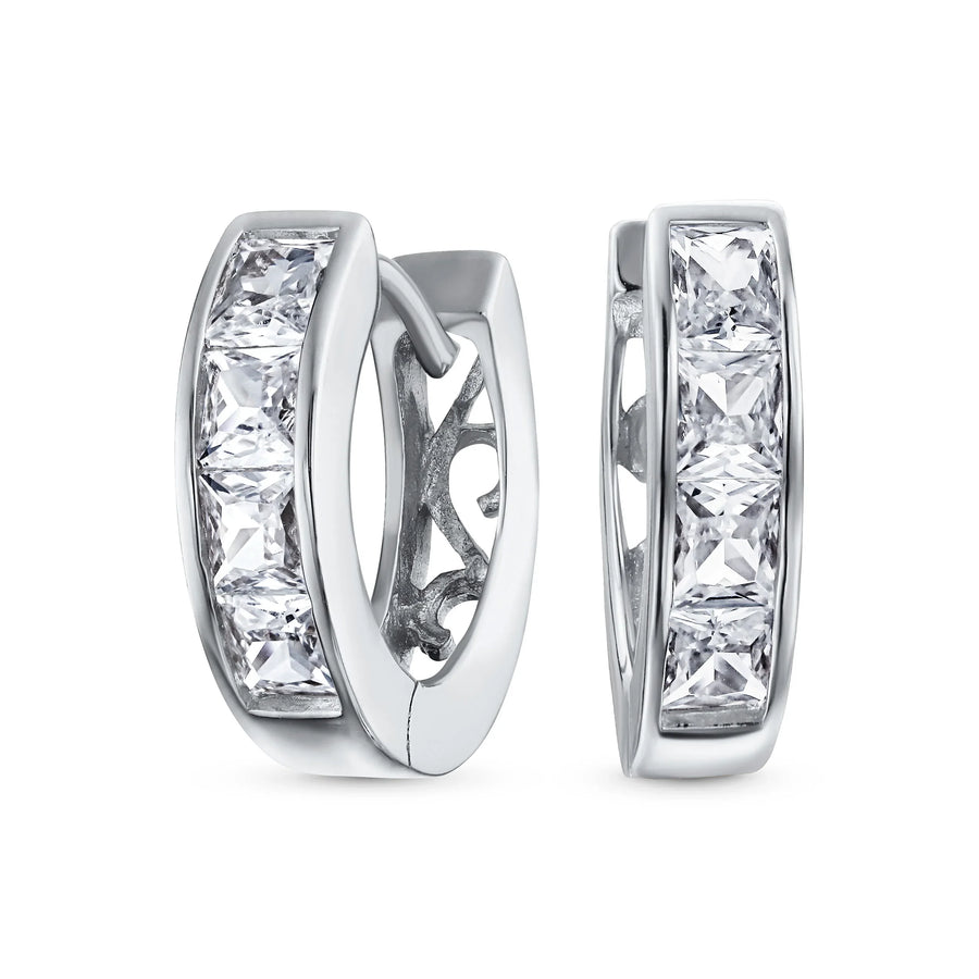 - Our Princess Cut CZ Filigree Vines huggie earrings are stunning. Featuring four square princess cut CZ stones in a channel setting. The back showcases an open vine filigree pattern. Hinged design snaps firmly into place for a snug fit. Crafted from .925 sterling silver and rhodium plated to resist tarnish. These lightweight, elegant huggie hoops complement any outfit. Perfect for pierced ears only.
