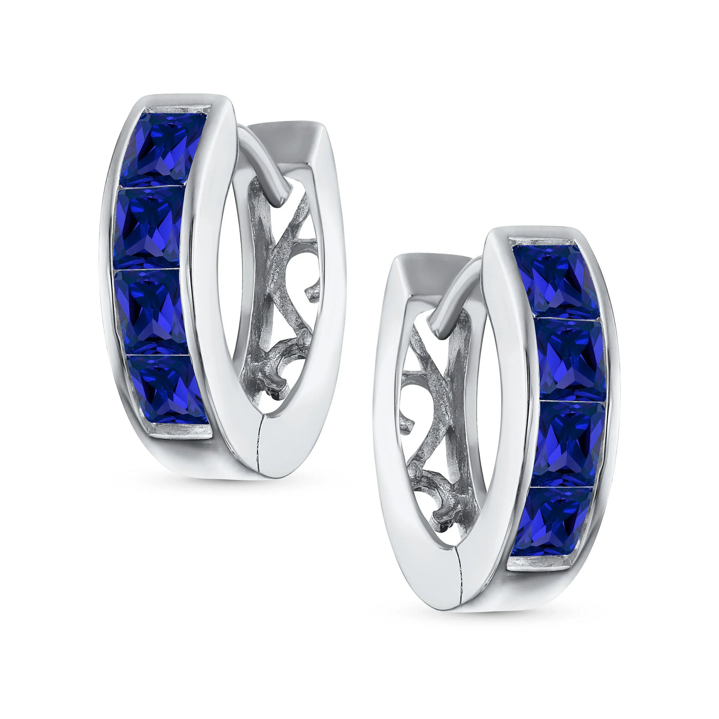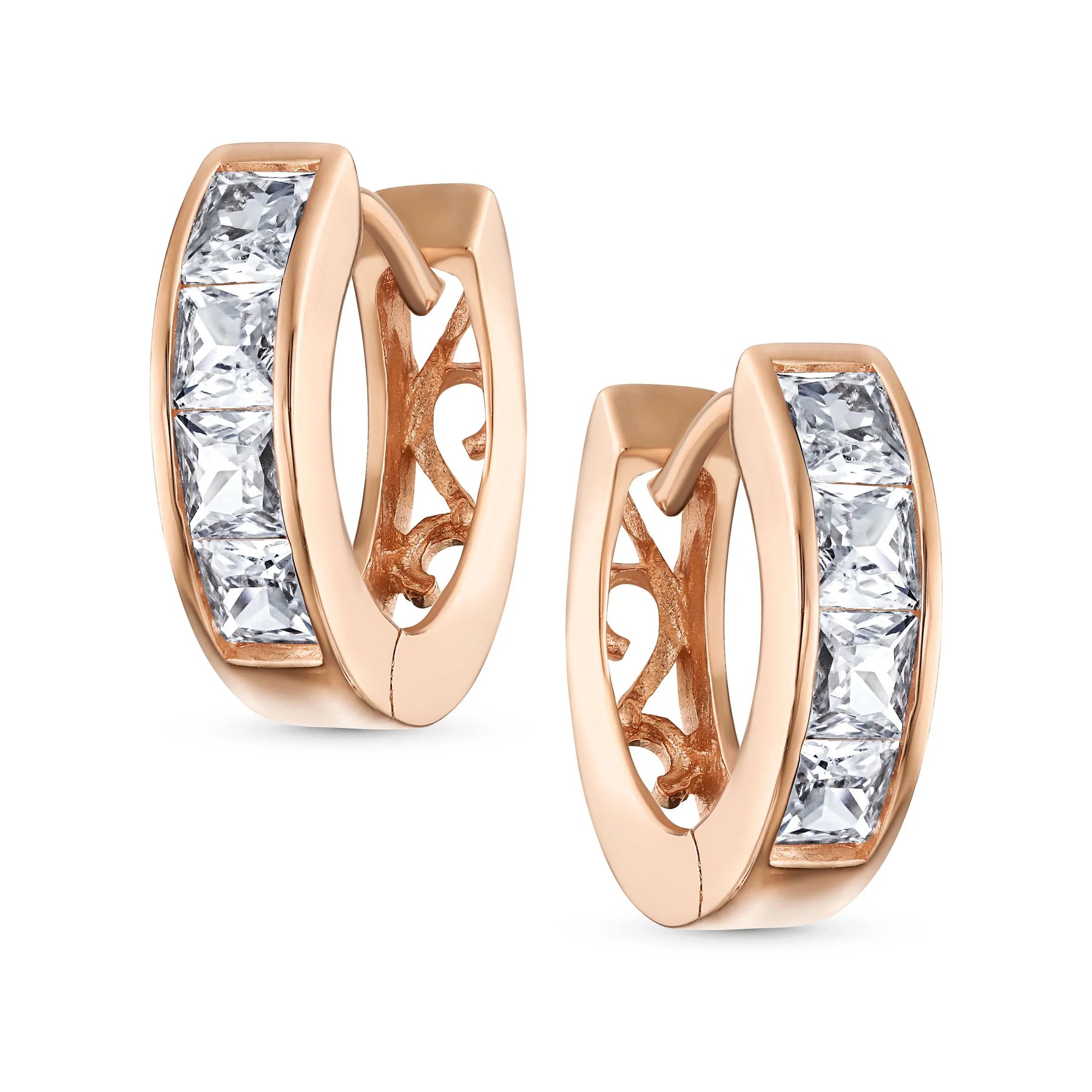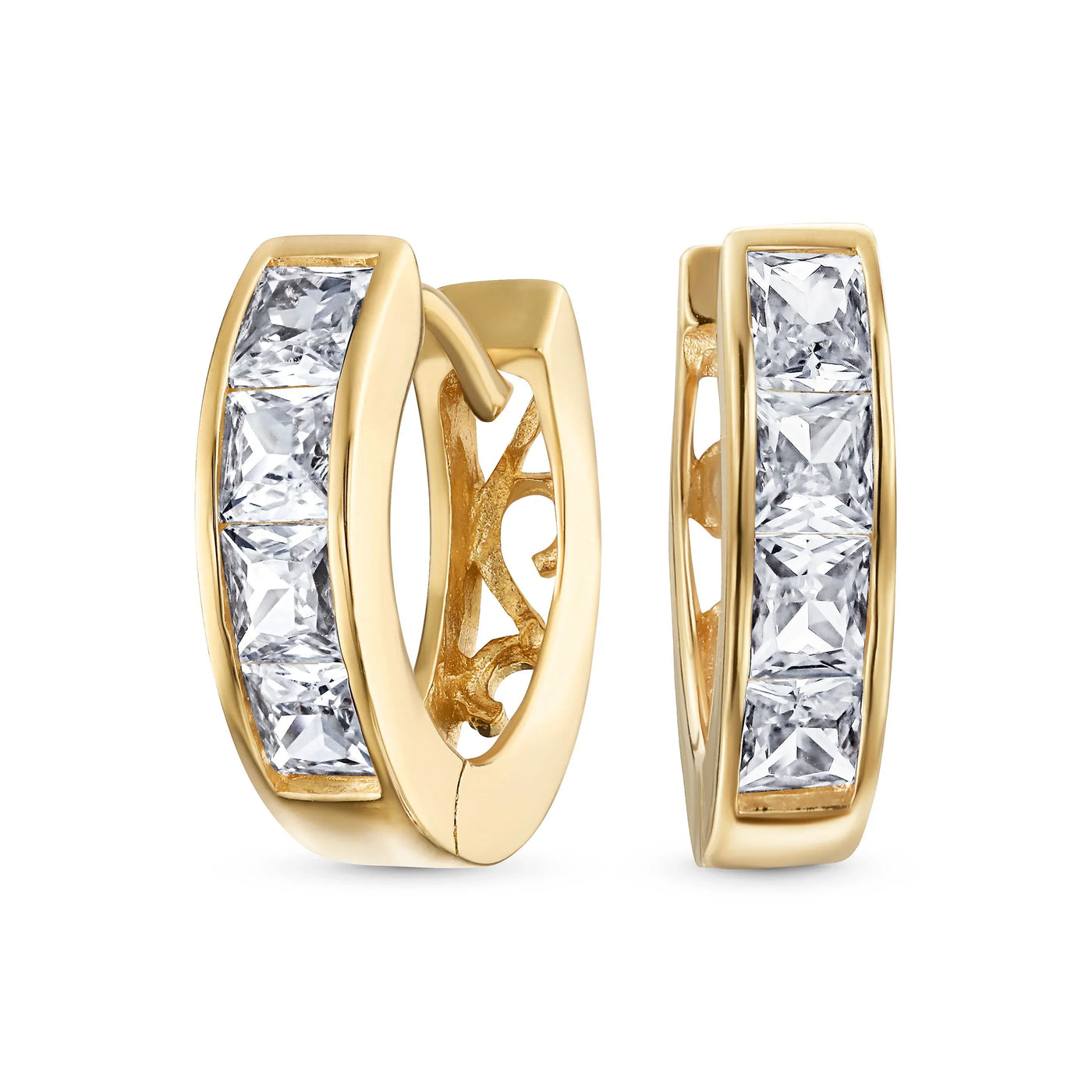 - Our Princess Cut CZ Filigree Vines huggie earrings are stunning. Featuring four square princess cut CZ stones in a channel setting. The back showcases an open vine filigree pattern. Hinged design snaps firmly into place for a snug fit. Crafted from .925 sterling silver and rhodium plated to resist tarnish. These lightweight, elegant huggie hoops complement any outfit. Perfect for pierced ears only.