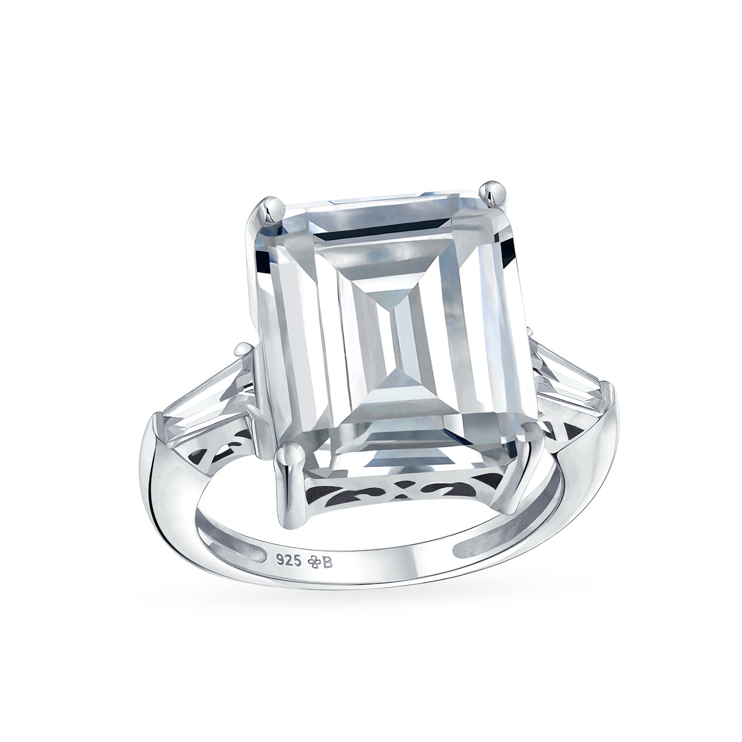 - STUNNING DESIGN - This radiant sterling silver engagement ring is sure to captivate her. Featuring a brilliant emerald-cut CZ center stone, complemented by intricately detailed shimmering baguette-cut CZ accents on each side.