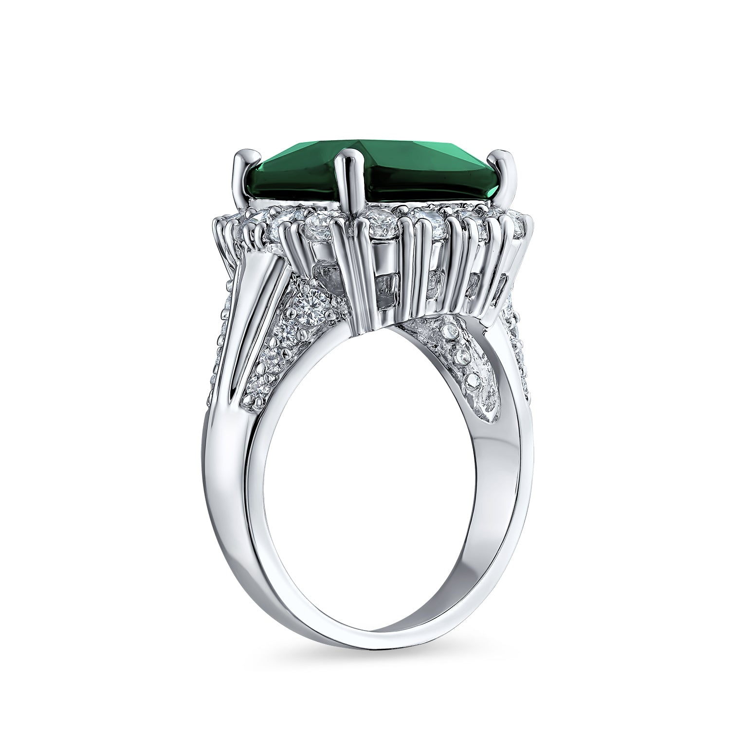 - For an instant dash of glamour and exquisite elegance, reach for this sublime, rhodium plated brass and cz cocktail ring. This stunning cocktail ring is highlighted by a majestic 10.3 CT simulated emerald, cz center stone, cushion cut enhanced by a shimmering, clear cz halo. Gorgeously chic for any formal event, this sublime ring is a perfect option for a May birthday gift.