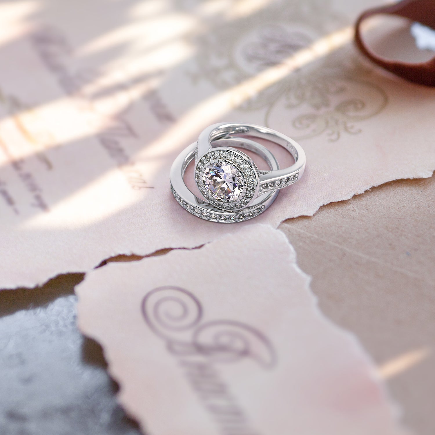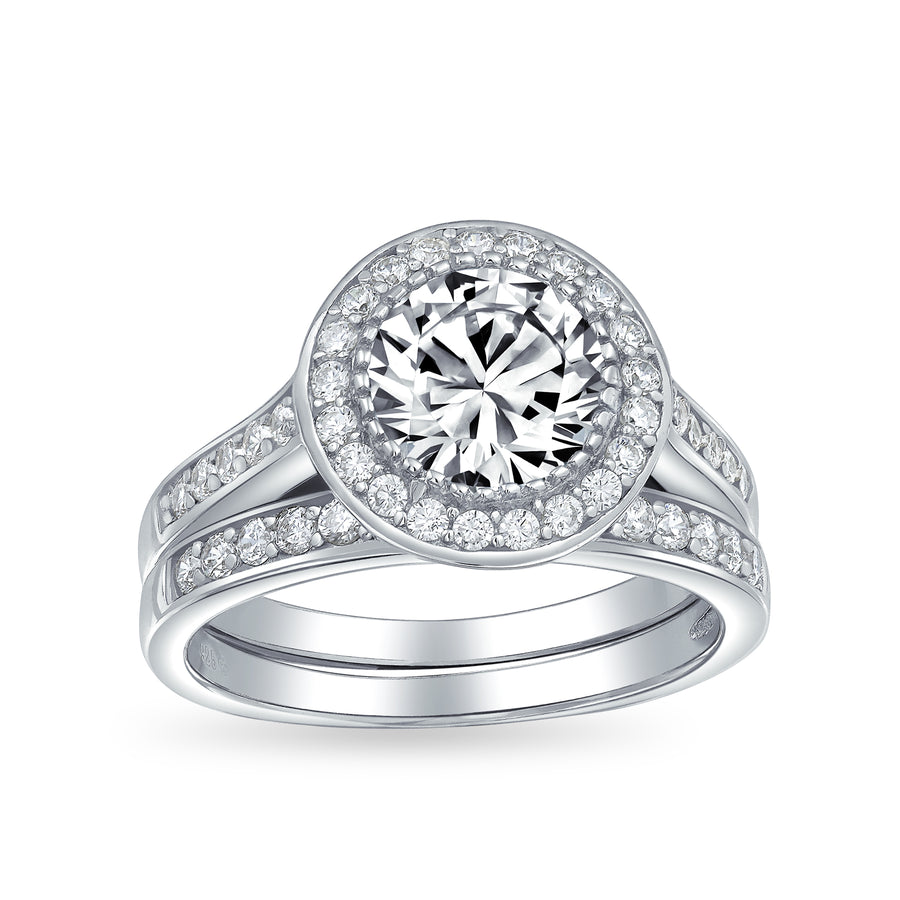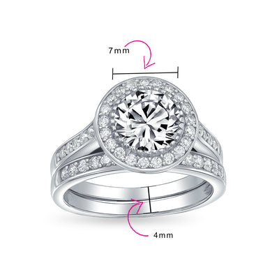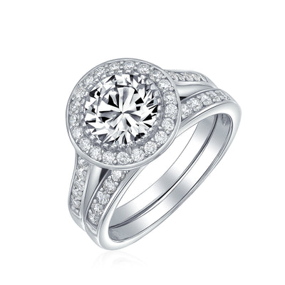 - Micro pave halo wedding ring band set featuring a stunning 3CT center stone in a sparkling halo frame, adorned with cubic zirconia accents. Includes a matching half eternity wedding band in a stackable design. PERSONALIZE – Add a custom engraving with words, inspirational messages, letters, numbers, dates, or coordinates in script or block letters. Our precision machine engraving ensures a beautifully displayed message. Click Customize Now to Order. HYPOALLERGENIC - Lead-free and nickel-free, each piece is stamped .925 to guarantee quality and craftsmanship.