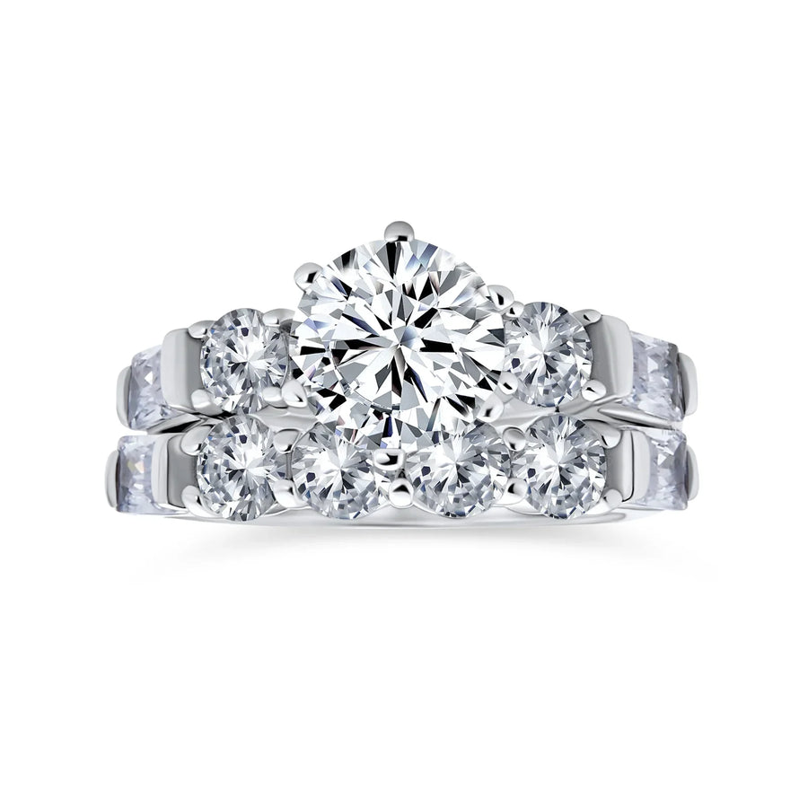 - Bridal Engagement Wedding Ring Set showcases a stunning 2 carat CZ stone in a six-prong solitaire setting, elegantly accented by round and baguette cut CZ stones on each side.