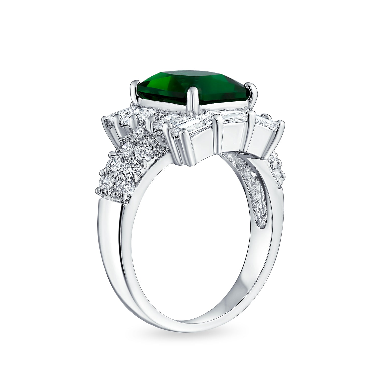 - Make her heart skip a beat with our stunning radiant cut engagement ring, a timeless piece she will cherish forever. This Art Deco Style ring features dazzling accents that add a touch of elegance to the design. Crafted from rhodium plated brass, the ring showcases a 10mm X 8mm glittering green Simulated Emerald color radiant cut cubic zirconia center stone, complemented by square and baguette clear cubic zirconia stones on each side. The top half of the band is adorned with pave CZs for extra sparkle and glamour. The Estate Style of the ring exudes sophistication and charm, making it the perfect gift for the love of your life, especially if she celebrates a May birthday. Surprise her with this exquisite piece of May birthstone jewelry and watch her eyes light up with joy.