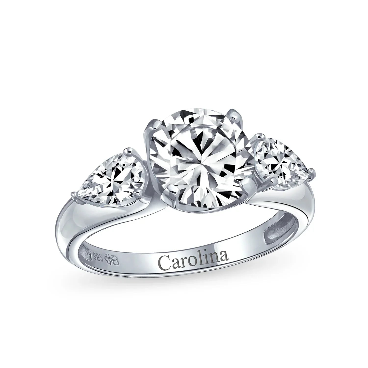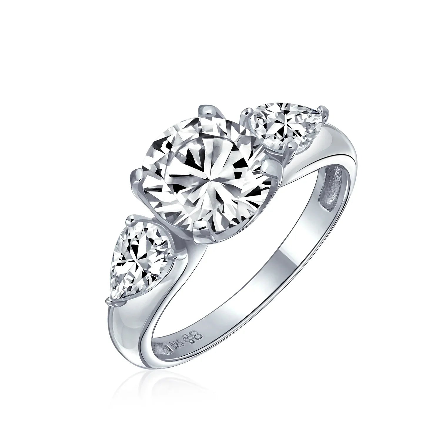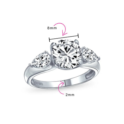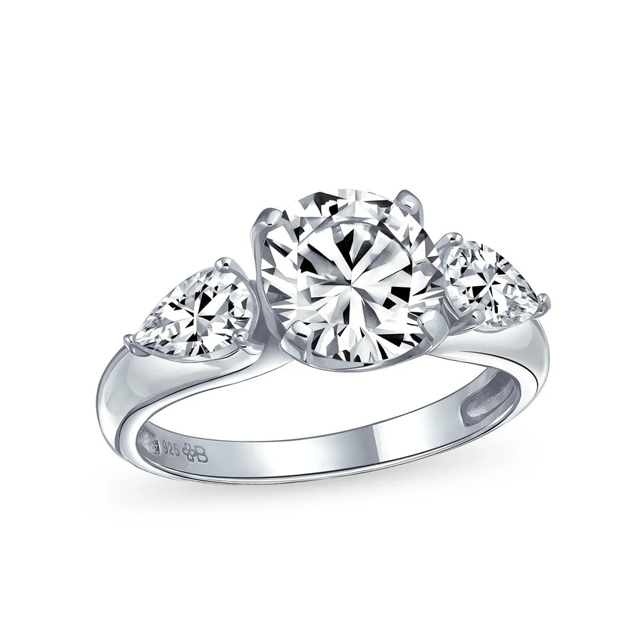 - Make a statement with our stunning pear-shaped CZ engagement ring. Crafted from sterling silver, it features a polished band. Three dazzling colorless CZ stones adorn the ring. The center stone boasts a classic round cut. Two glamorous pear-cut stones flank the center for elegance. Vintage Style charm adds timeless sophistication. Perfect for the stylish and sophisticated individual. Give her a ring that shines bright for a lifetime.