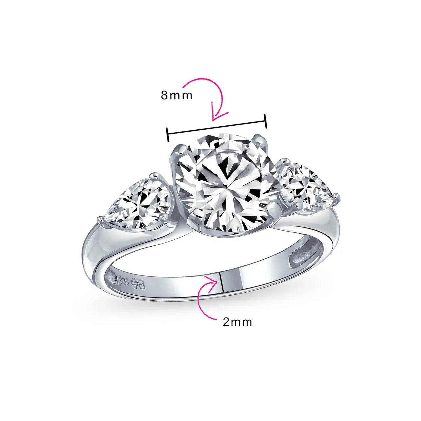 - Measure: Center Stone: 8 MM Bottom Band 2 MM W, Weight: Approx. 4 - 6 Gram, Material: Genuine .925 Sterling Silver Anti Tarnish Rhodium Plated, Cubic Zirconia, HYPOALLERGENIC - Lead-Free Nickle-free. Each piece is stamped