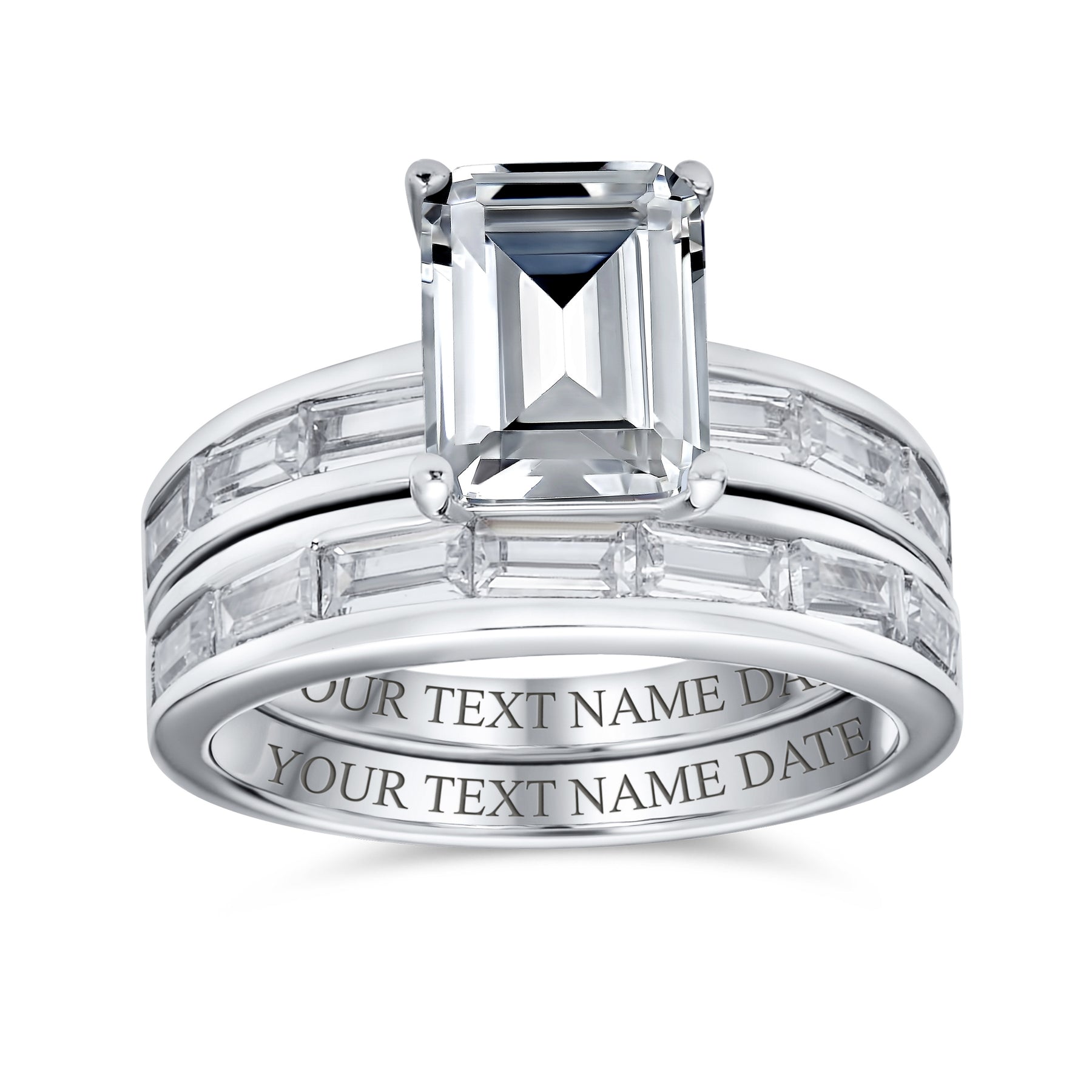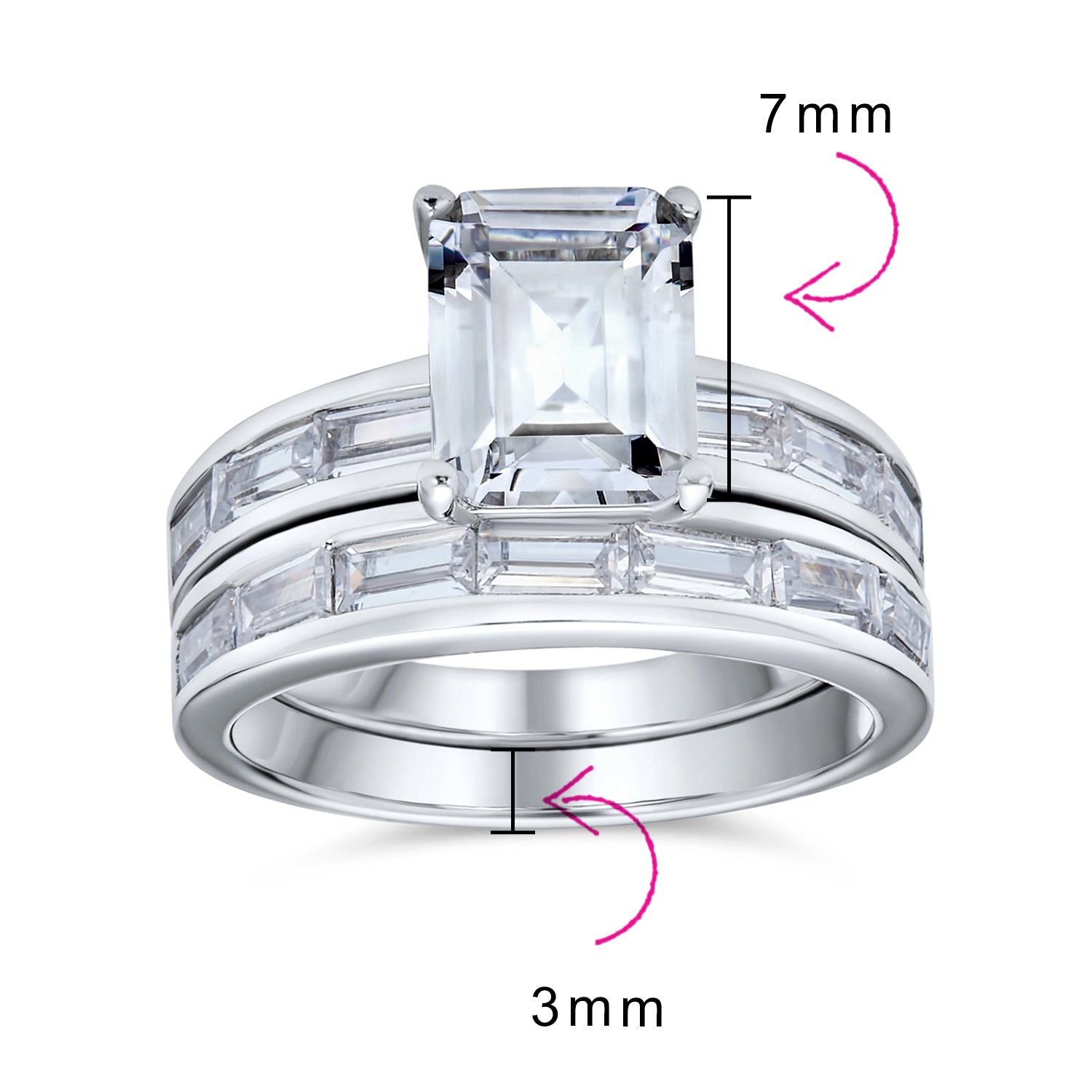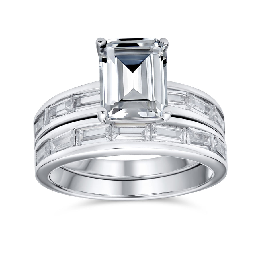 • She is sure to exclaim "yes" when you gift her with this exquisite anniversary set ring. Celebrate timeless elegance with this Art Deco-inspired ring set featuring a 2CT emerald-cut cubic zirconia solitaire and channel-set baguette band. Crafted in sterling silver, it’s perfect for travel, or are a promise ring.