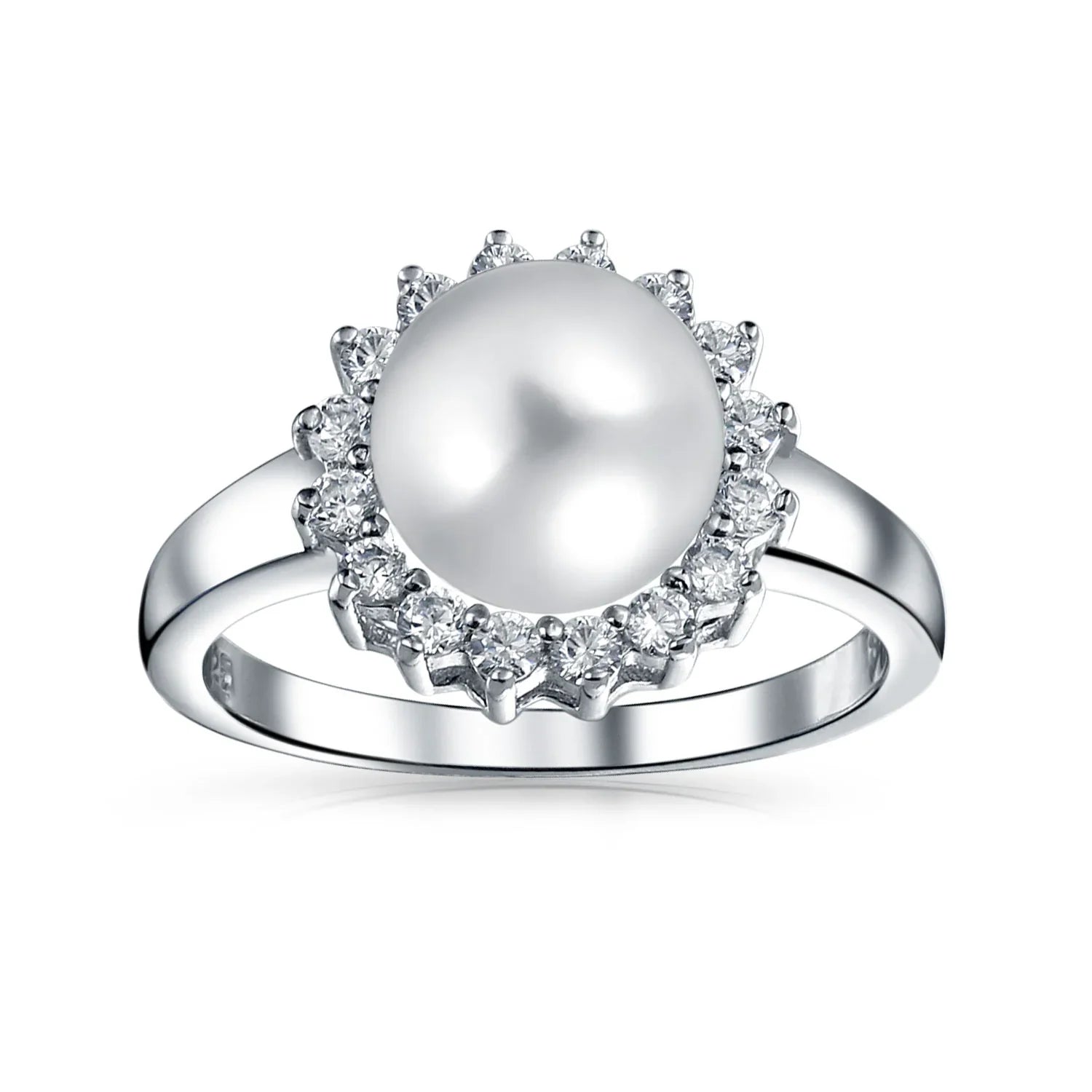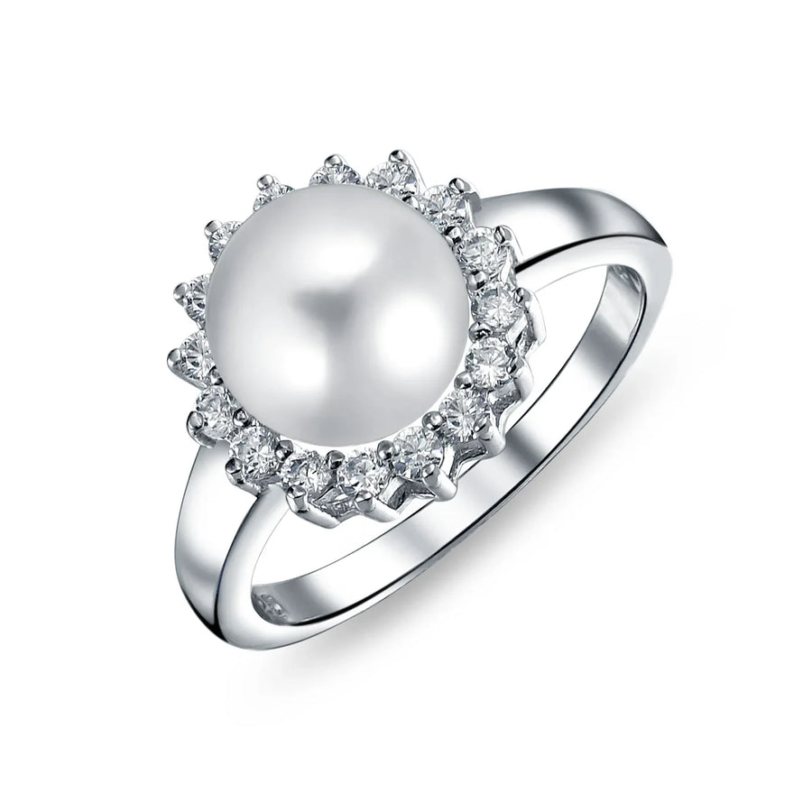 - Elegant and glamorous, our newest CZ pearl ring features a 9mm white pearl framed by sparkling CZs in a halo setting. This classic sterling silver engagement ring is a must-have for every chic lady's pearl jewelry collection. Perfect as a promise ring, it makes a sensational choice for that special someone. Ideal for bridal party gifts, this CZ pearl ring is perfect for upcoming weddings. Our June birthstone ring, with a 3mm band width, offers both comfort and fashion.
