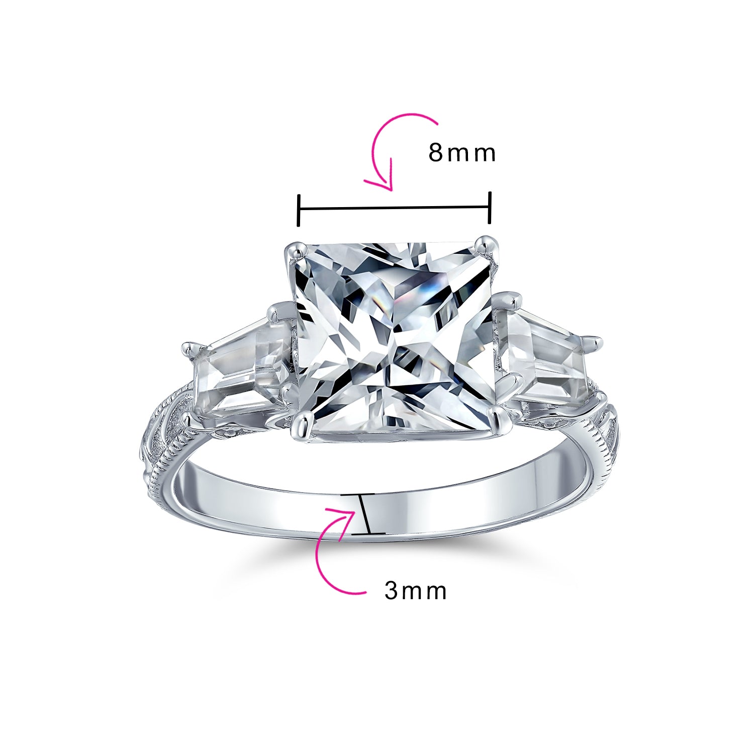Vintage Style 3CT CZ Princess Cut Engagement Ring Baguette Side Stones Silver