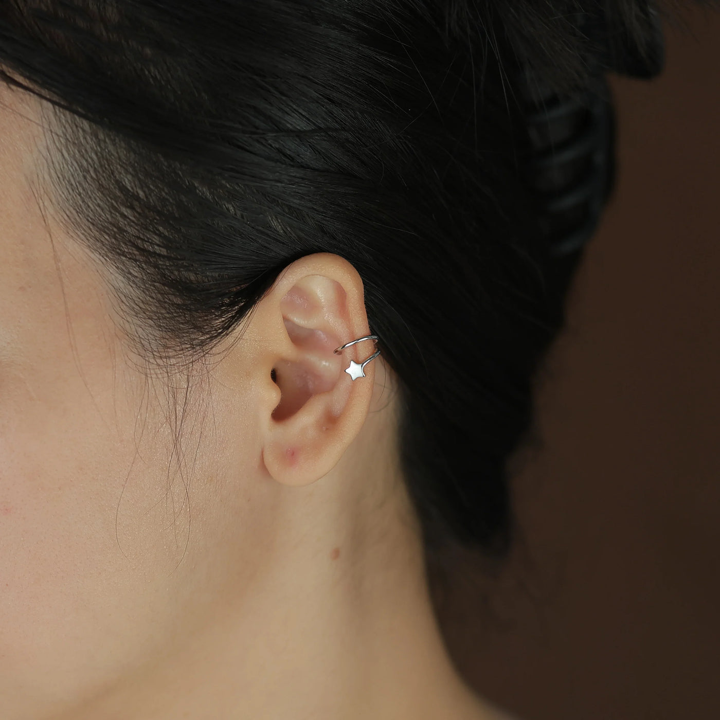 - Add celestial charm with these minimalist .925 silver cuff earrings. Graceful curve design with dainty star motif. Clip-on, no piercing needed.