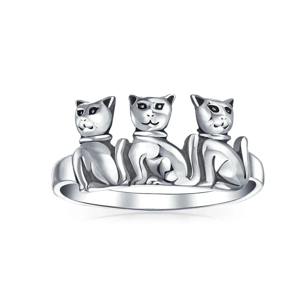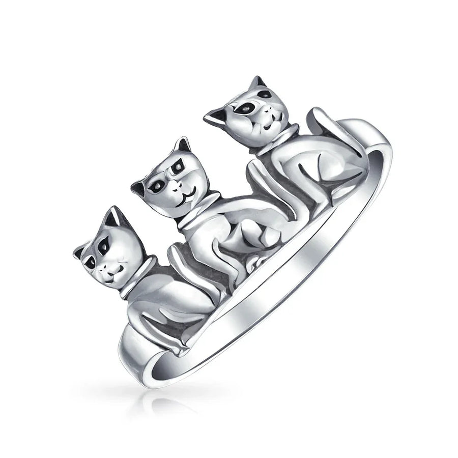- Adorable sterling silver triple cat ring for animal jewelry lovers. Three cats in a row make it eye-catching fashion jewelry. Perfect for women of all ages. Ideal animal lover gift. Material: .925 Sterling Silver, 2mm Band Width, 2.50 grams.