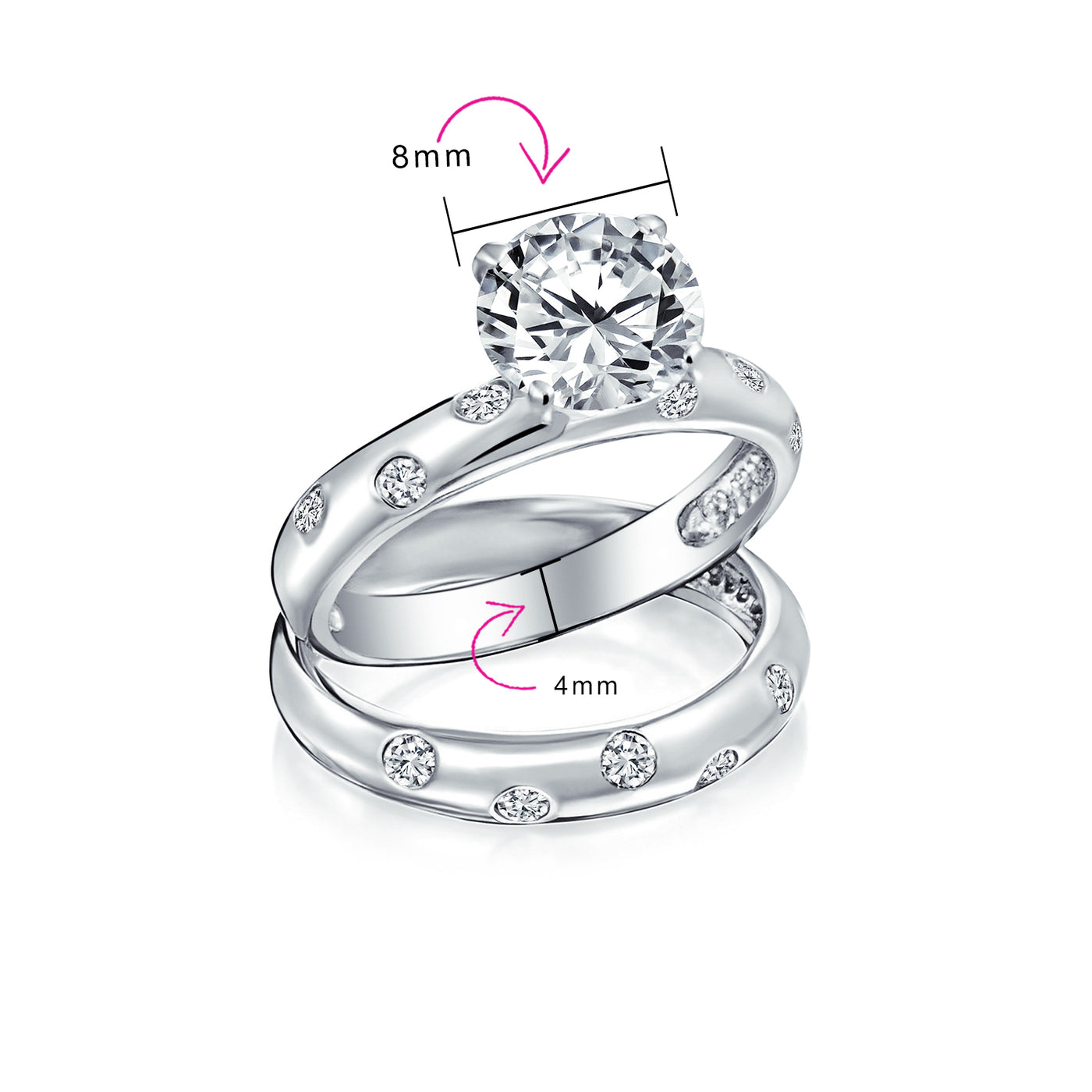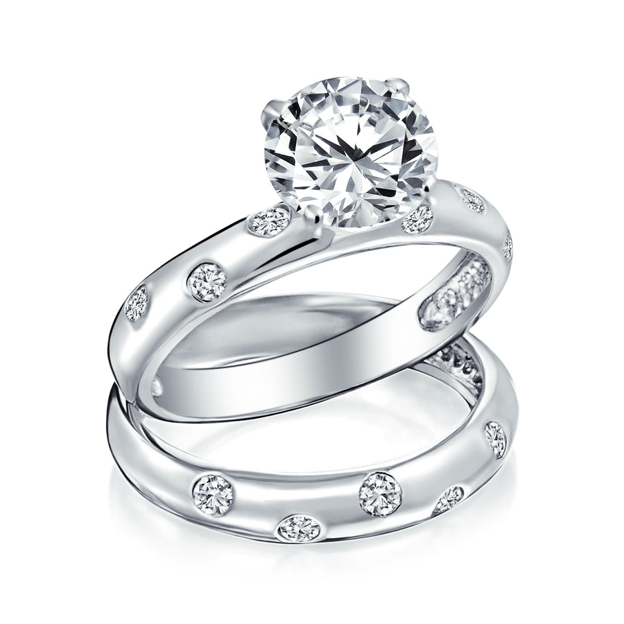 • This etoile engagement Wedding Ring Set features solid .925 sterling silver and cubic zirconia. Glamorous bands with sparkling round cut CZs. The centerpiece is a dazzling 2 carat round CZ in a classic 4 prong setting. Rhodium plating ensures a luxurious look and prevents tarnish. This bridal set will make you look fabulous on your special day.