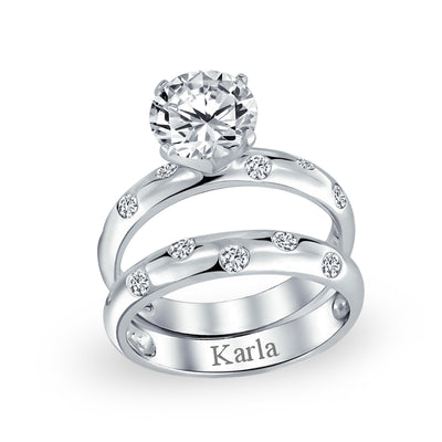 • Etoile Motif Engagement and Wedding Ring Set - PERSONALIZE: Engrave with your choice of words, inspirational messages, letters, numbers, dates, or coordinates in script or block letters. Our precision machine engraving ensures a beautifully displayed message. Click Customize Now to order. HYPOALLERGENIC: Lead-free and nickel-free. Each piece is stamped .925, guaranteeing quality and craftsmanship.