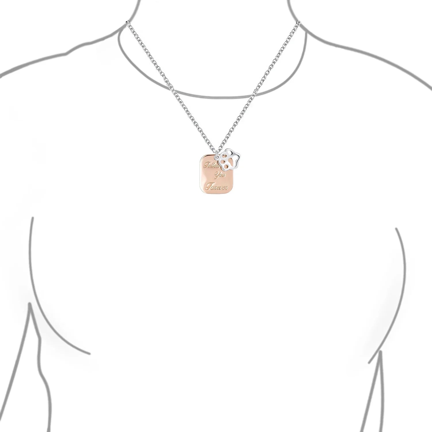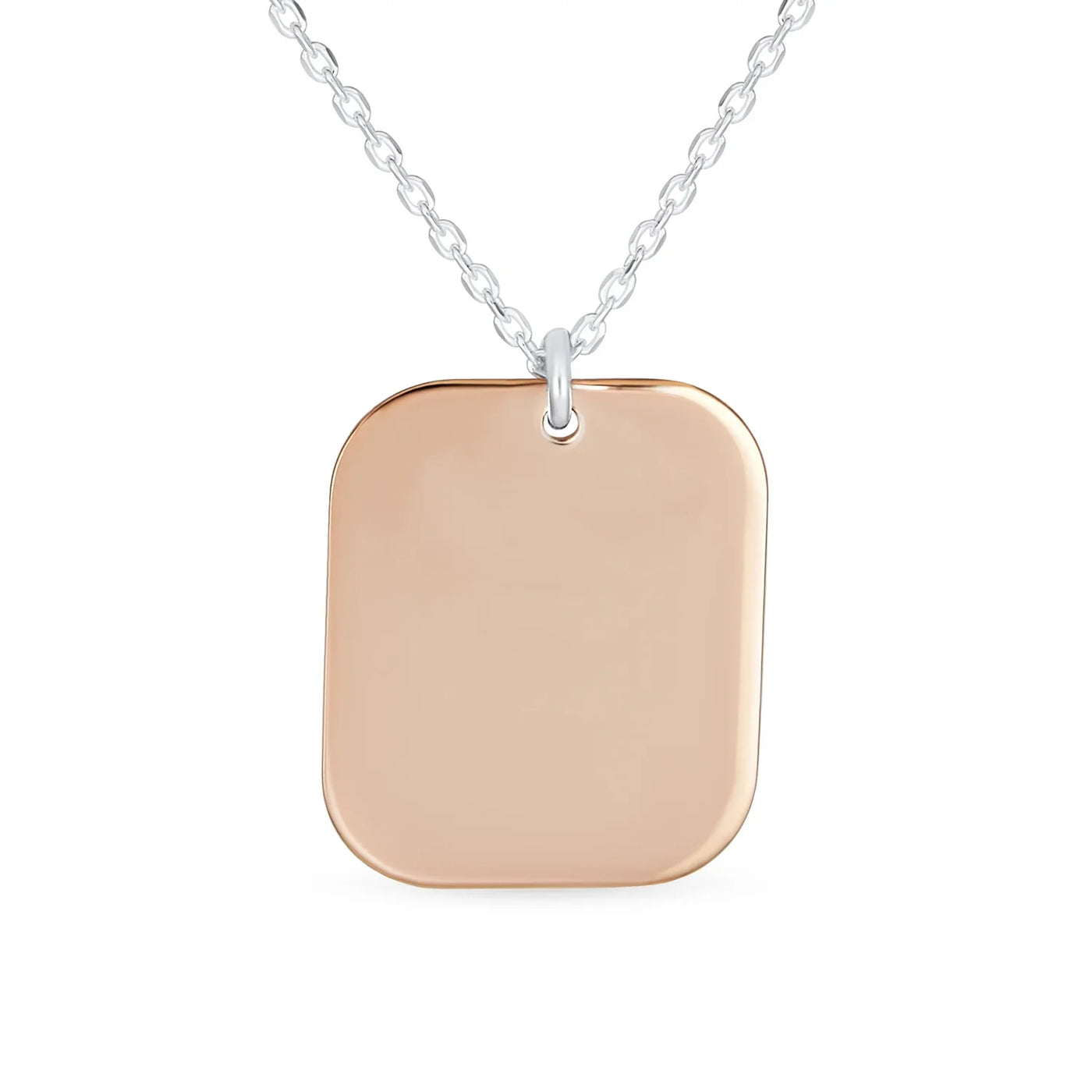 • Show your eternal bond with your furry friend with this pre-engraved dog tag pendant featuring a charming paw print design. The rose gold plated rectangle tag can be personalized with your own engraving on the back. Perfect for dog and cat lovers, this playful accessory is a heartfelt way to showcase your love for your pet