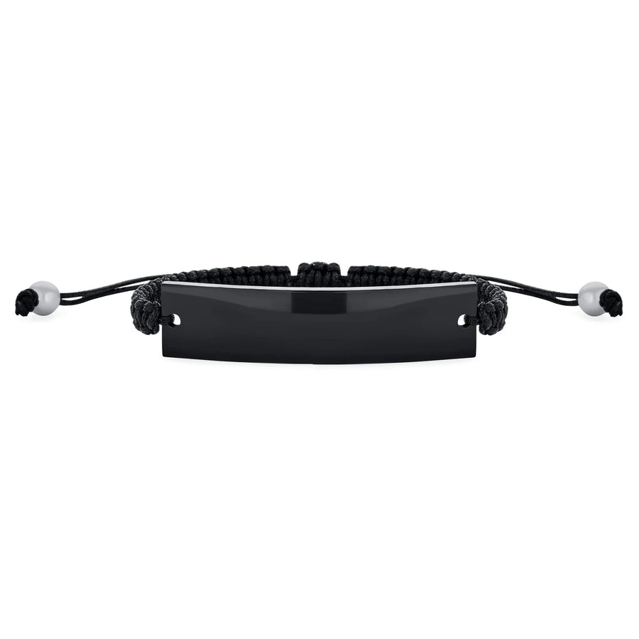 - Introducing our stylish black name tag braided rope bracelet, a must-have accessory for any fashion-forward individual. This unique bracelet is crafted with multiple thin strips of black nylon braided rope, creating a sleek and modern bolo ID design.