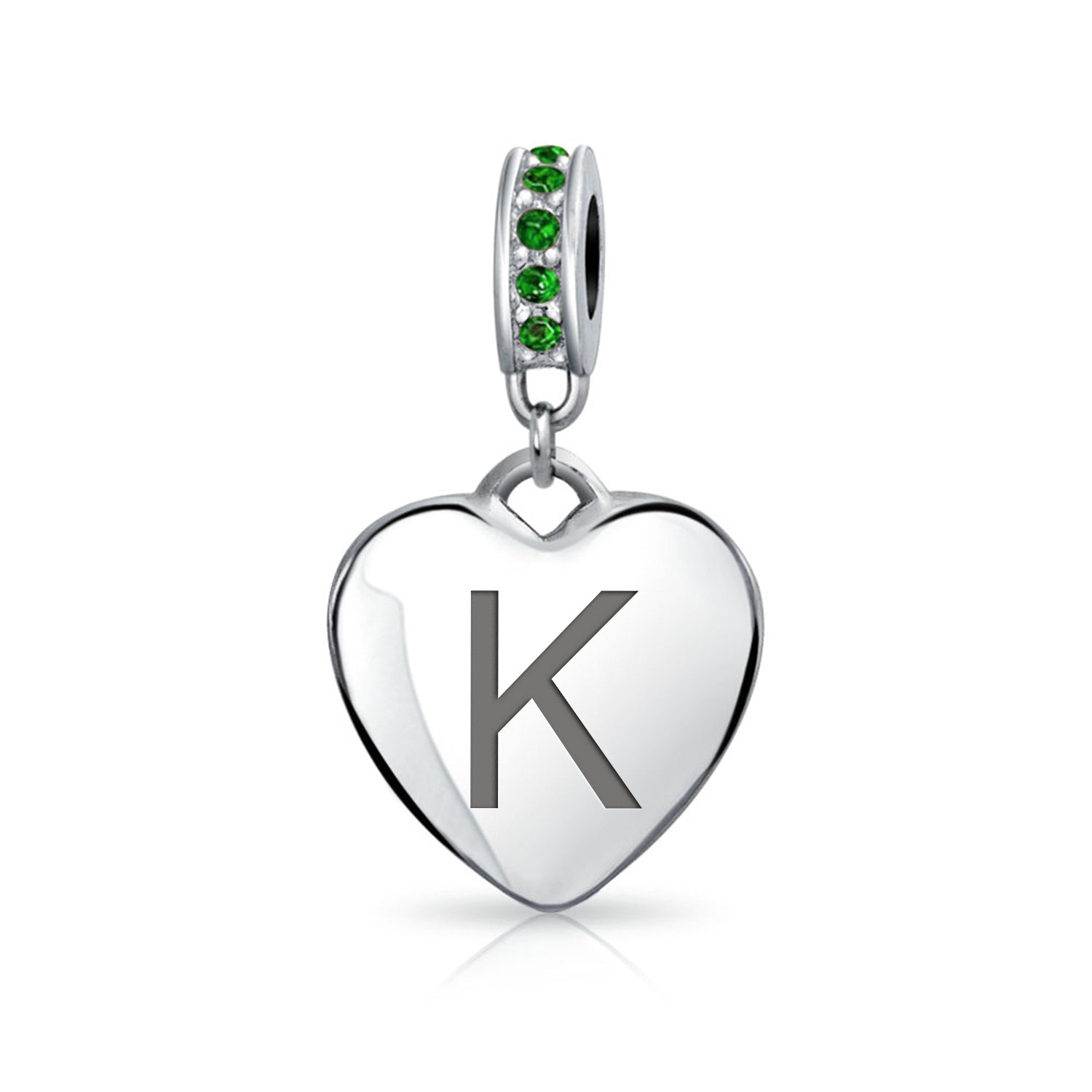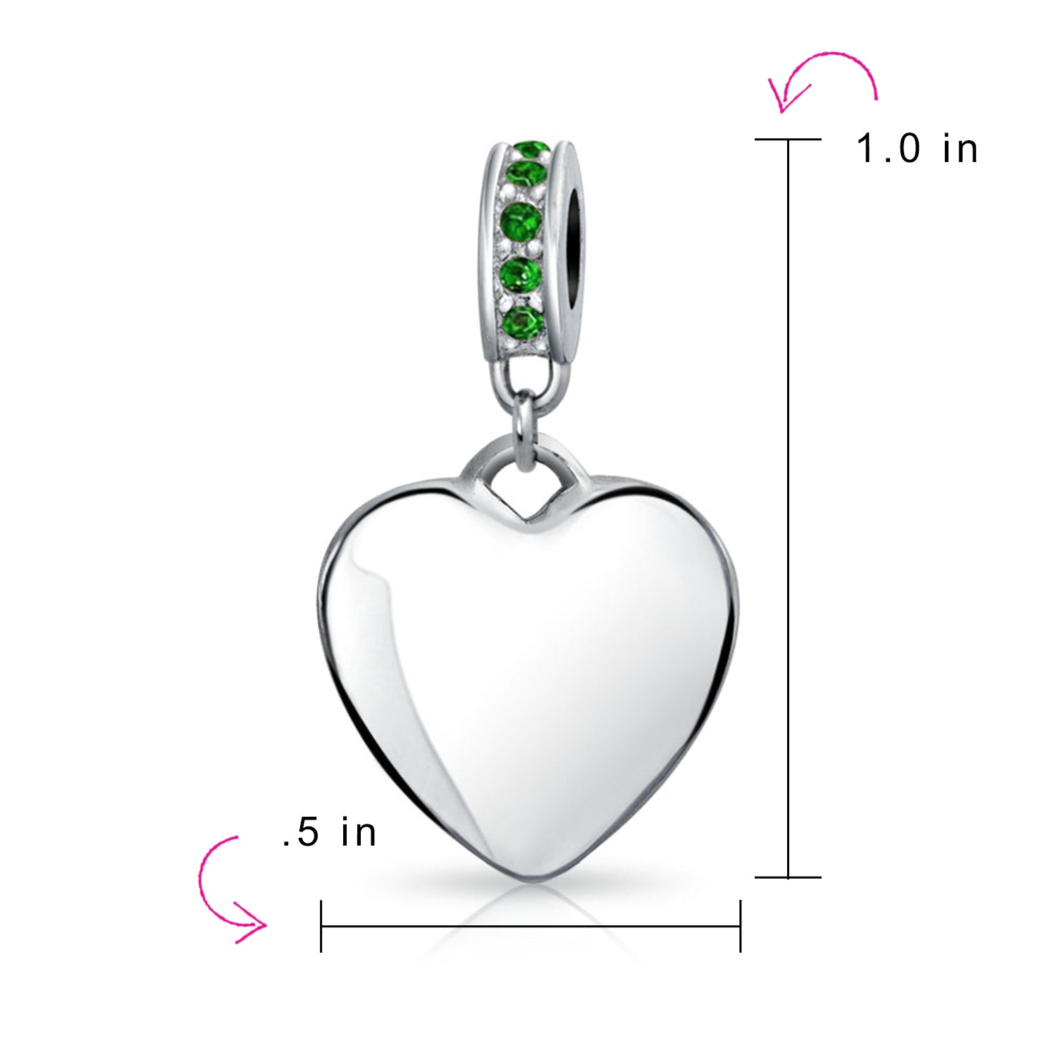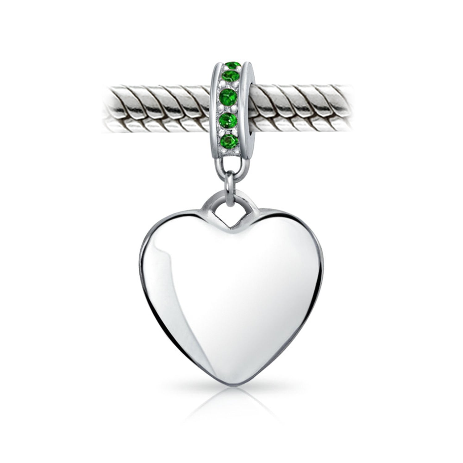 - Why not engrave names, inspirational message, letters, numbers, date or coordinates. This modest polished heart shaped charm hangs from a 4.5mm unthreaded core and holds a single, elegant green simulated Emerald May birth month color, perfect for bringing that unique something to your bead story.