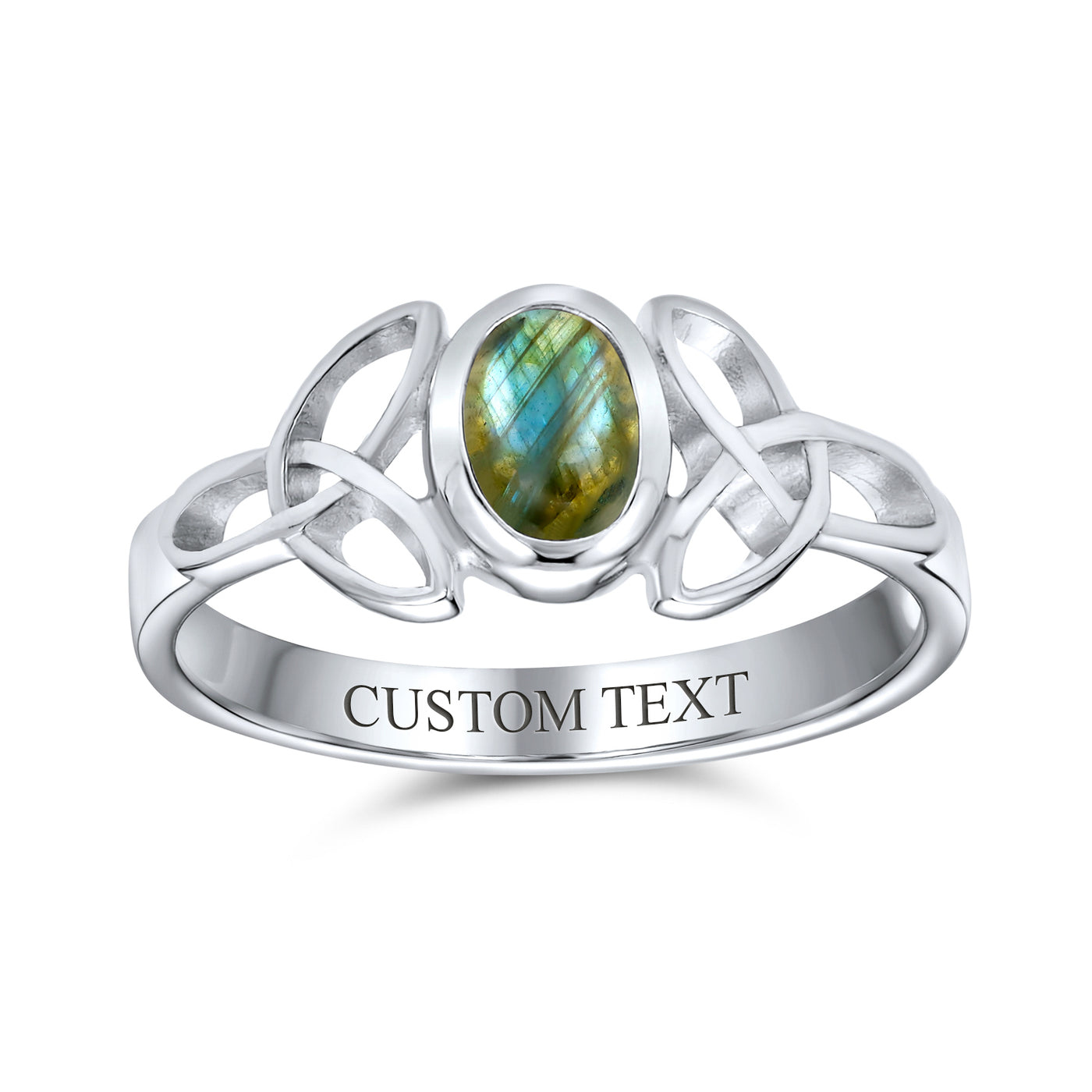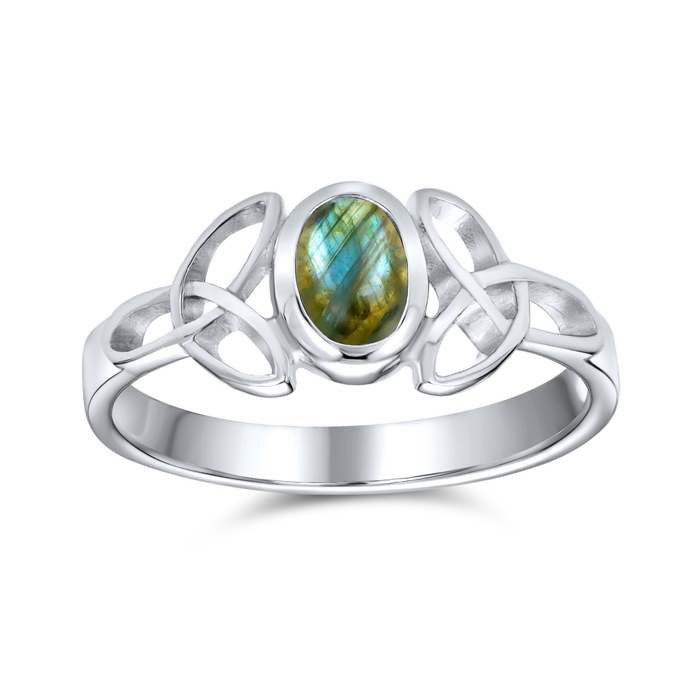 - Elevate your style with this stunning sterling silver ring, featuring a captivating Celtic design. The focal point is a vibrant oval Iridescent Labradorite stone, encircled by an intricate infinity knot symbol motif.