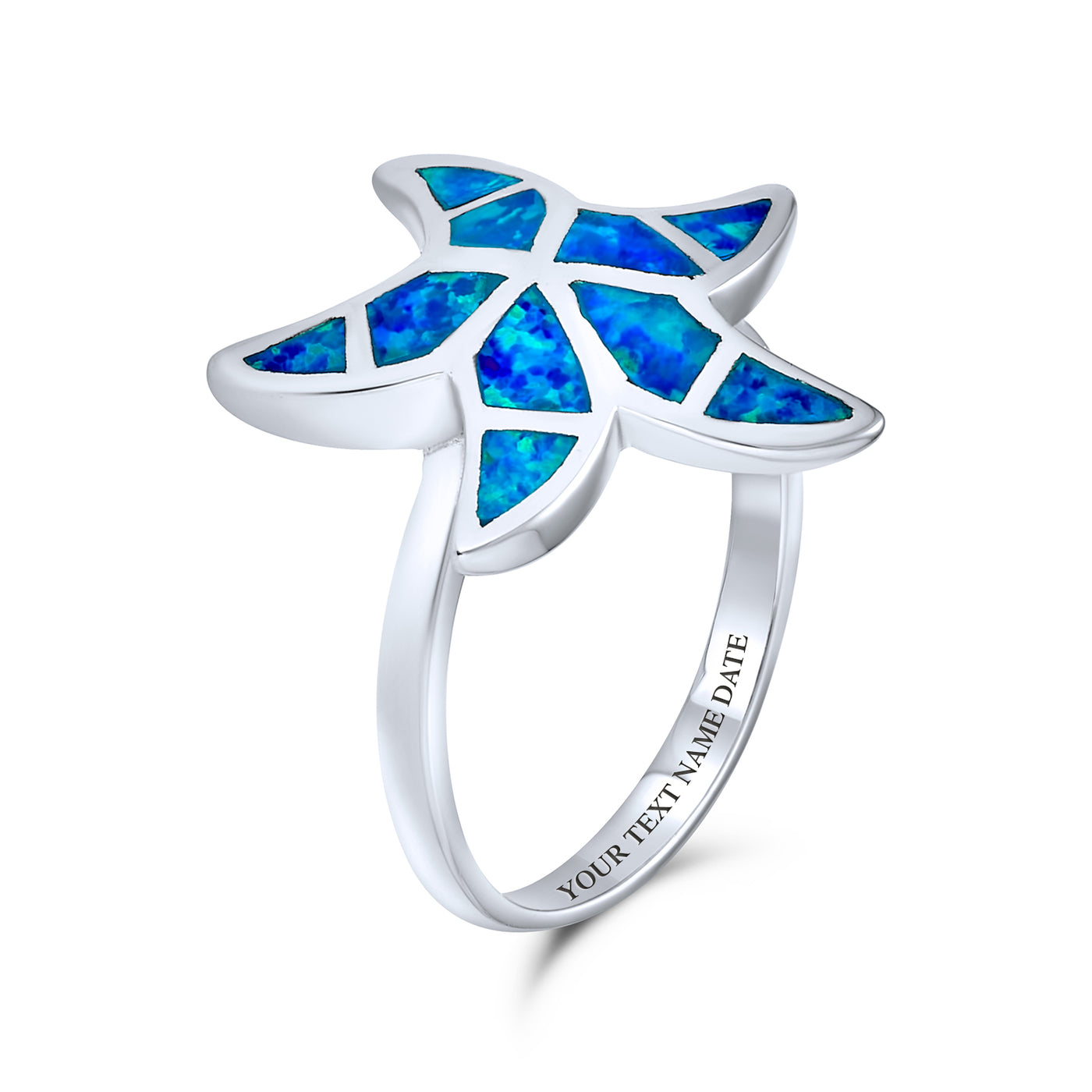• Add a sterling silver starfish ring to your jewelry collection. Perfect for nature lovers, animal lovers, or blue jewelry fans. Created Blue Opal rings make sensational gifts. Ideal for October birthdays. Polished to a bright shine and rhodium plated to prevent tarnish. This piece will look new for years.